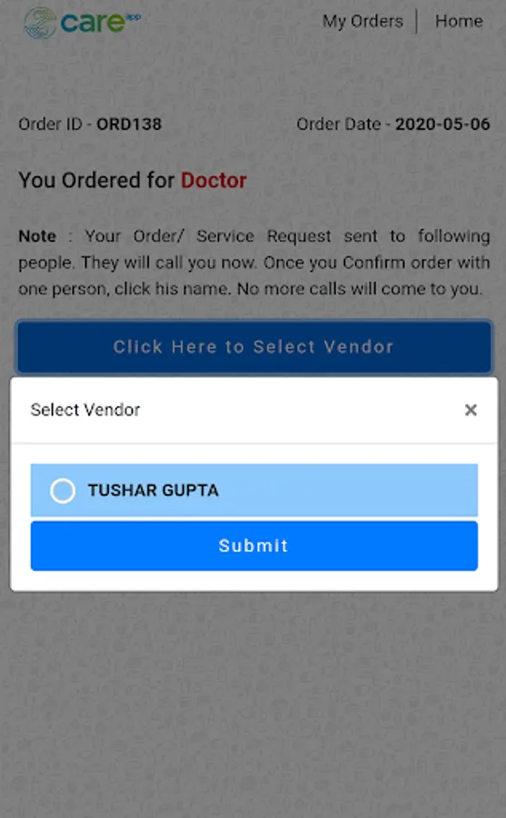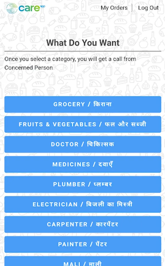 Care App helps people order their daily essential needs like groceries, fruits & vegetables, plumber, electrician, doctor, medicines, carpenter, painter etc. in the easiest way just at the click of a button. Talk directly to the vendor and service provider. Pay directly to him after getting service. Negotiate with him. No service charges, no hidden charges. Lodge complain to us if you don't get service. Enjoy!