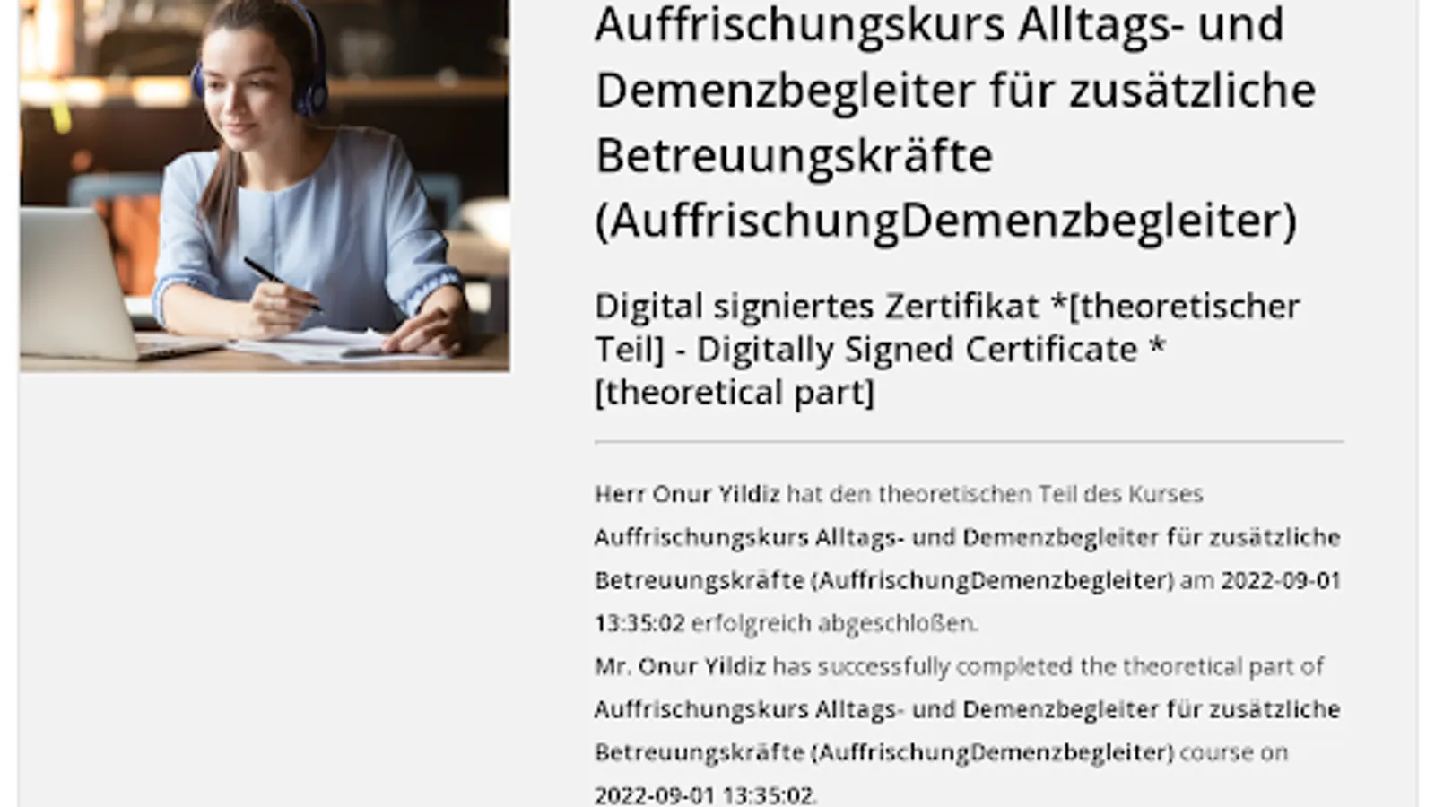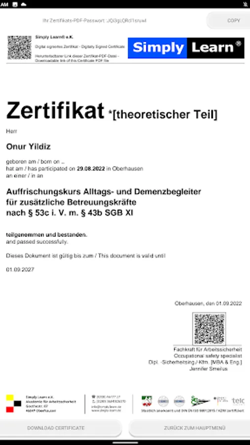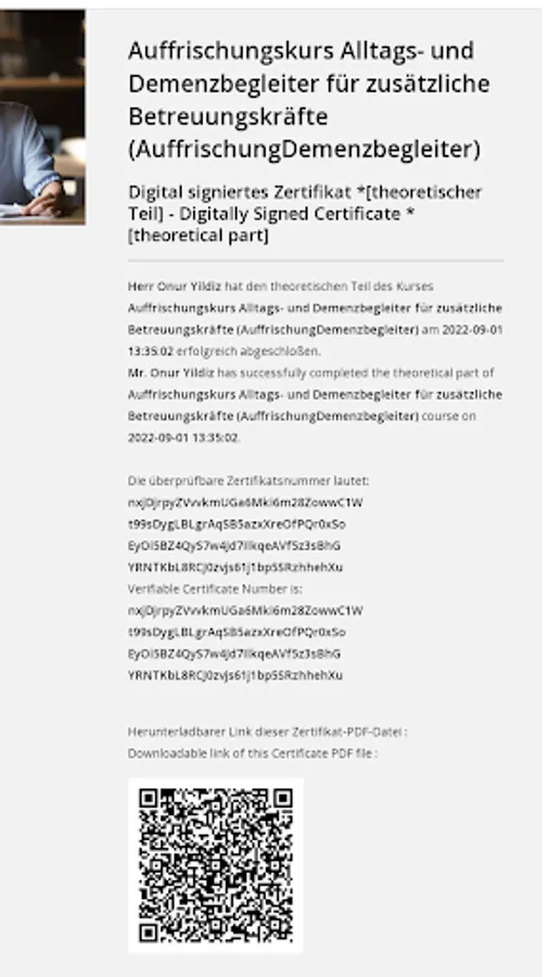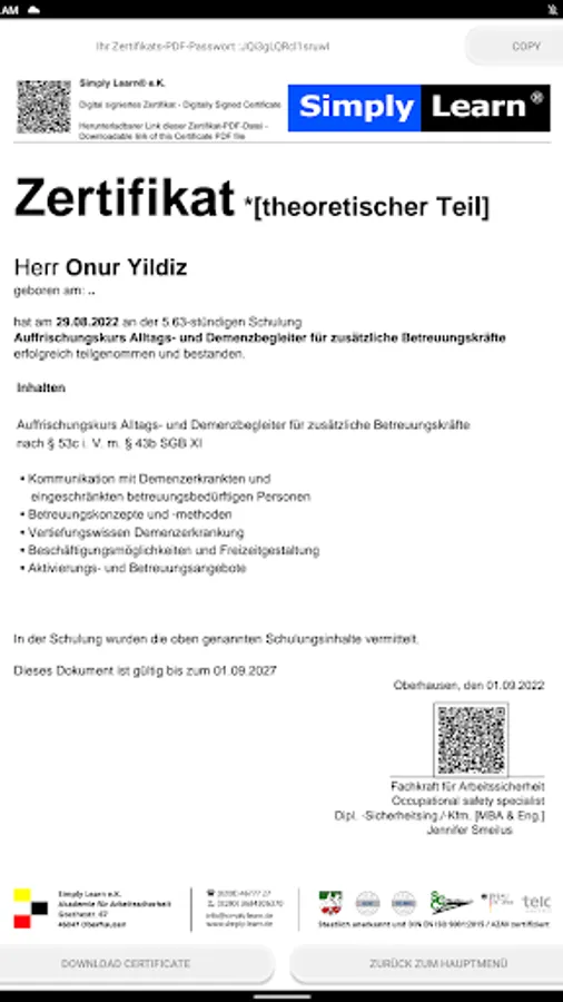Once you have successfully completed the self-study part, you can come to our training facility for the practical part. Feel free to contact us to book the 8.5 hours. plan flexibly with us. If you have also completed this phase, you have successfully completed the refresher course for dementia caregivers.