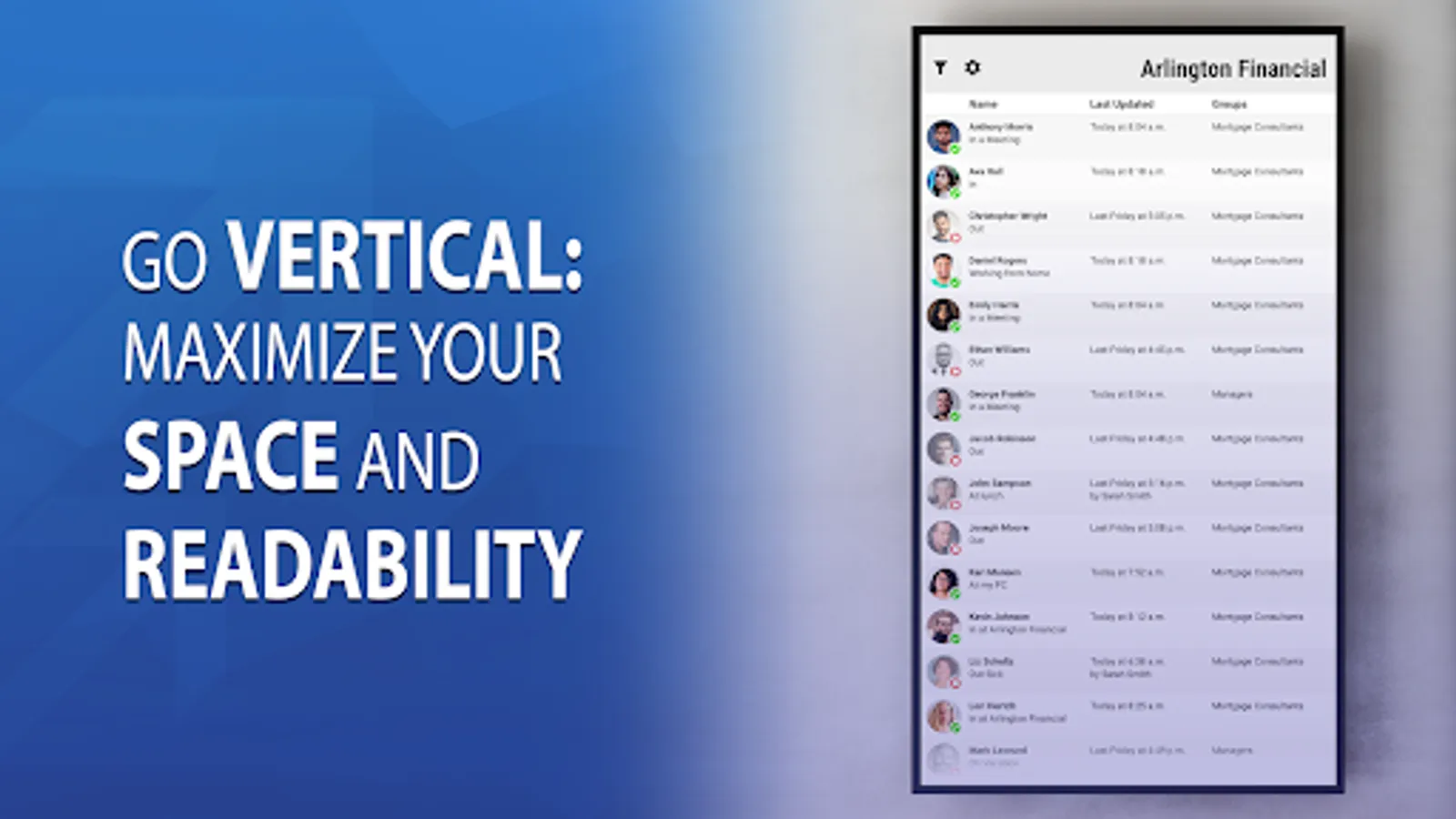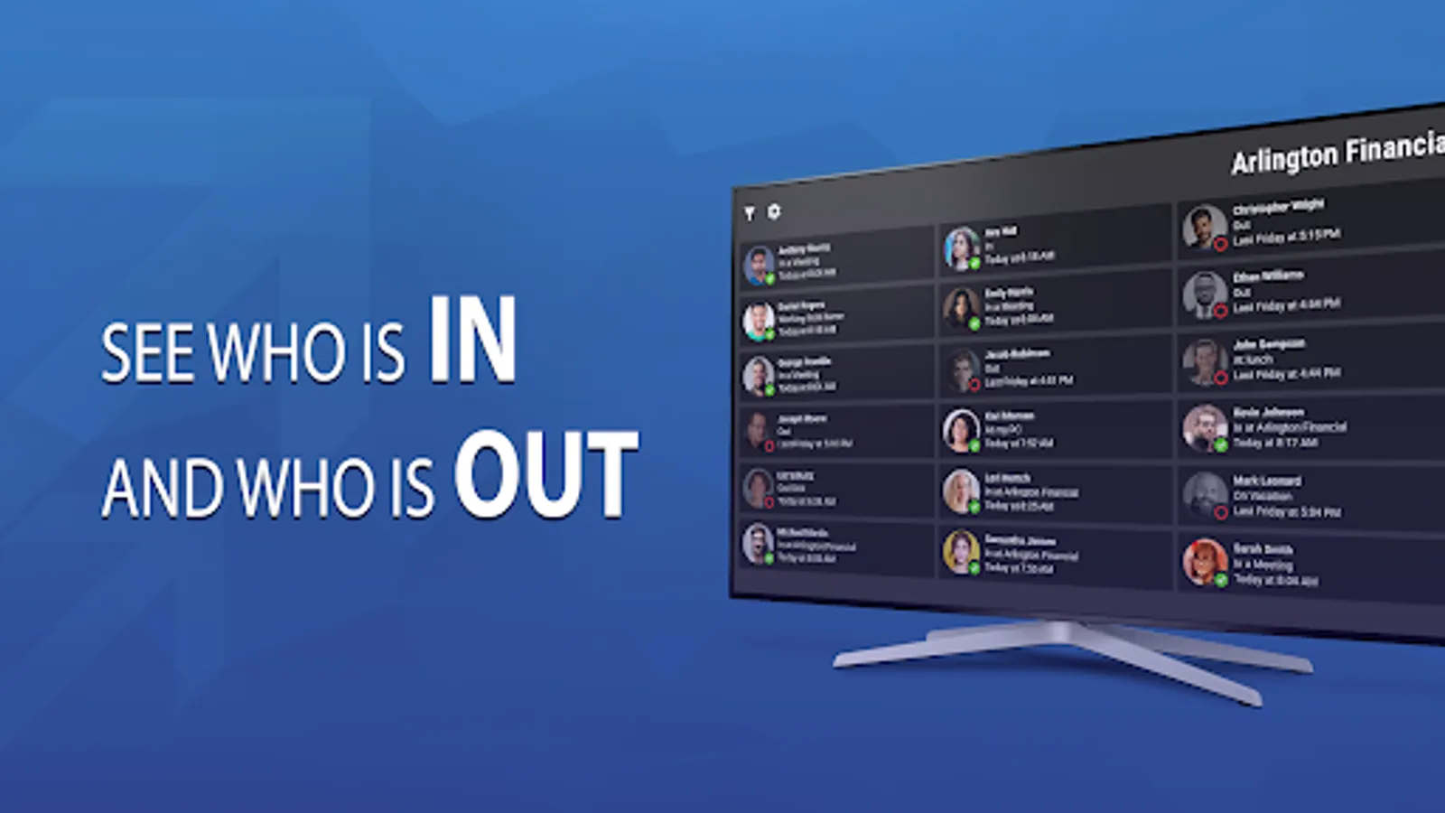Simple In/Out TV is a dedicated tv app that uses the Simple In/Out service. Now you can display your list of users in the lobby, break rooms, conference rooms, or any common area where you need to see who is in or out. Simple In/Out is the easiest to use in/out board in the Play Store. It is great for offices with people always on the go. Use of this app requires a Simple In/Out account. To sign up for a 45 day free trial, head to the website and sign up today.
