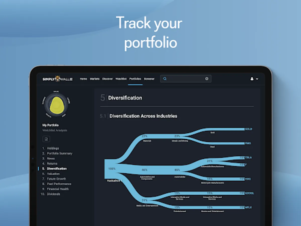 We analyse your portfolio and visualise it so you have a full understanding of the where you are invested, and your strengths and weaknesses.Track your portfolio and stay up to date with the latest news and analysis.