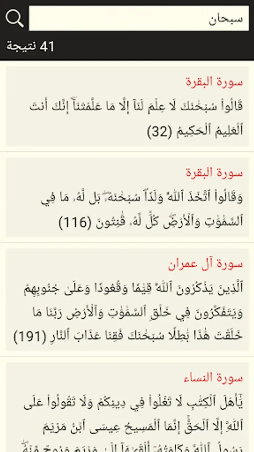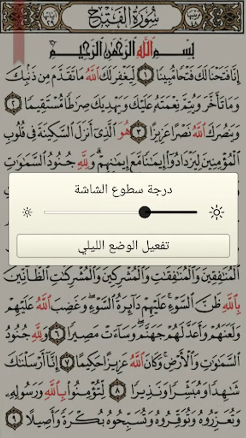 The Holy Qur’an is complete without an internet connection and it is completely identical to the Qur’an in addition to the search feature and the prayer of sealing and the ability to put a mark and index of the fence and the index of parts and parties and the ability to move to any page and the program maintains the screen setting lit for those who wanted to continue reading for a long time with the ability to control the degree of screen brightness with the ability to read the situation Night and in the event the program is closed at a specific page and opened again, it will automatically go to the page at which it was closed in addition to the ability to read in both horizontal and vertical positions and with a clear line and the background color of the pages is comfortable to eye