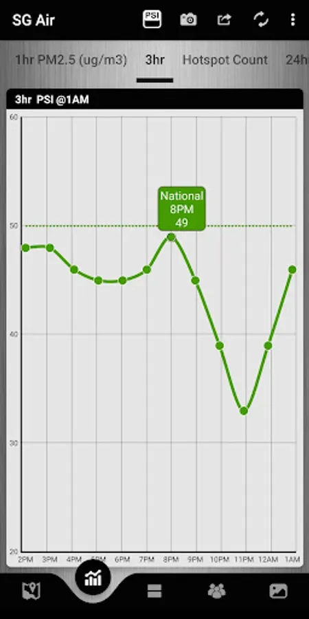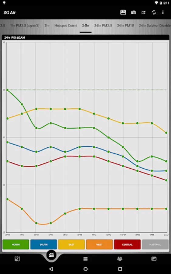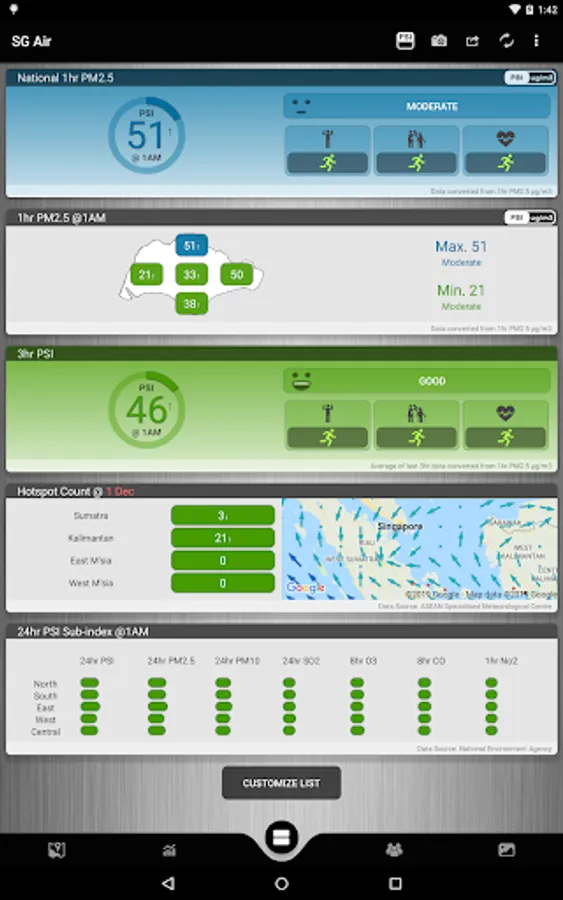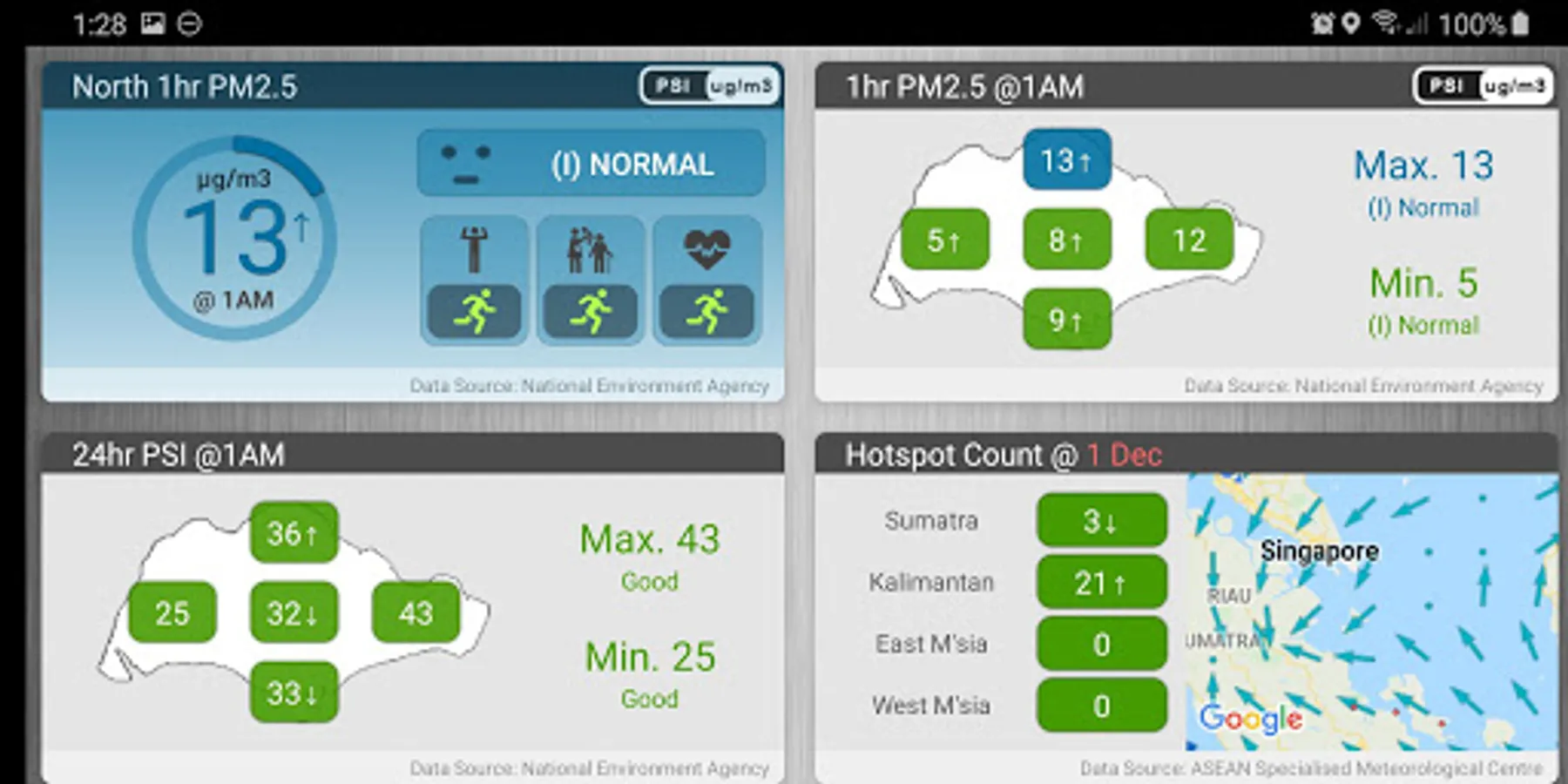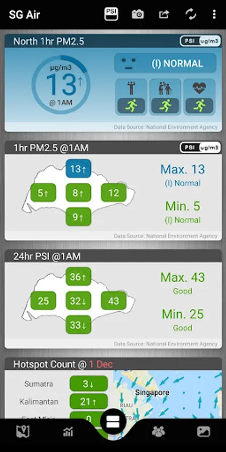 - Line charts with 24hrs data including 24hr PSI/AQI, Sumatra Hotspot Count, 1hr PM2.5, 24Hr PM2.5, 24Hr PM10, 24Hr SO2, 1Hr NO2, 8Hr O3 and 8Hr CO.