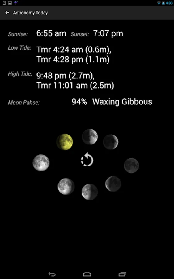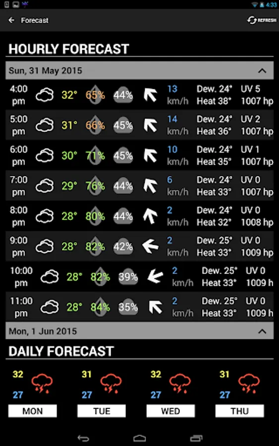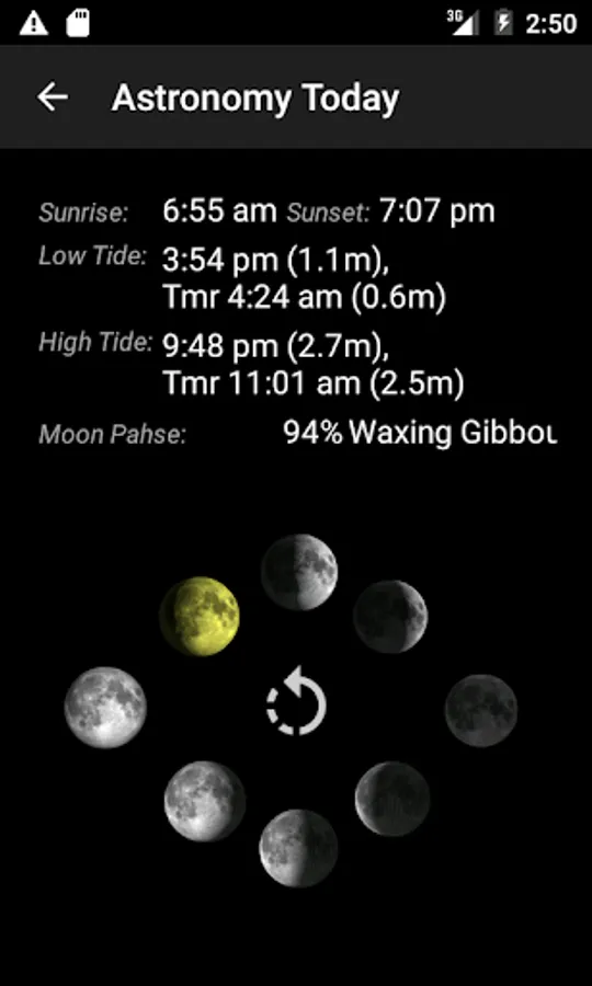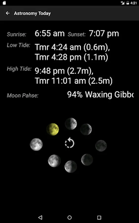 - Weather Today, additional weather info like humidity, wind, sunrise and sunset, moon phase and tide.