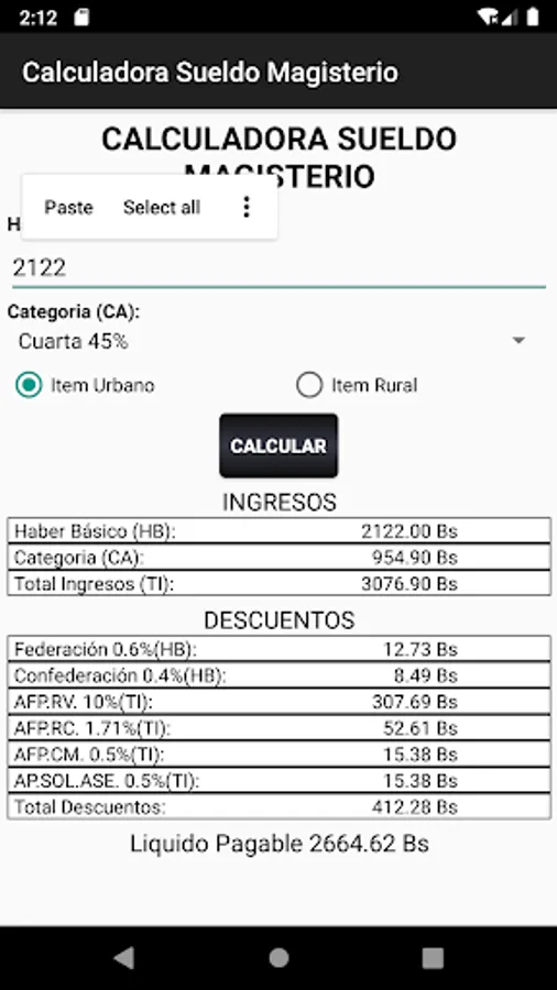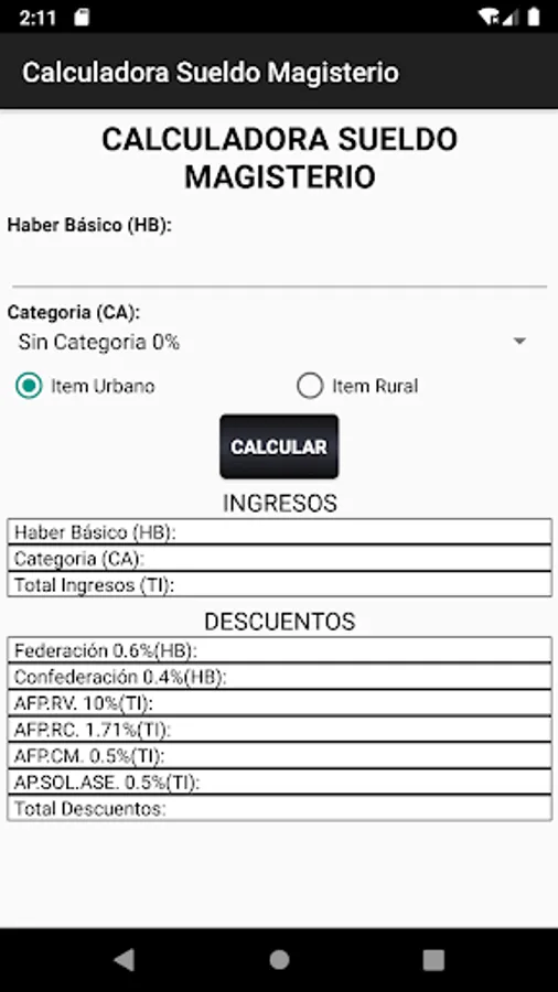 Calculate your salary according to the categories you select and just press the "CALCULATE" button and a description of your income and discounts will appear.