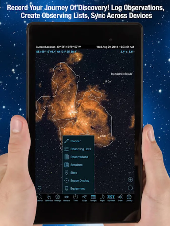 8) Share It. SkySafari 6 is more than just a mobile sky map app, it’s a new system to help organize and share your observing experiences. With a free signup, you can see and share your observing data from our web portal, LiveSky.com! Affordable premium memberships add online editing, so you can not only view, but edit your observations, add new observing sites, manage your equipment and more. Finally, you can view, edit and manage your settings files with SkySafari Web, our fully functional web version.