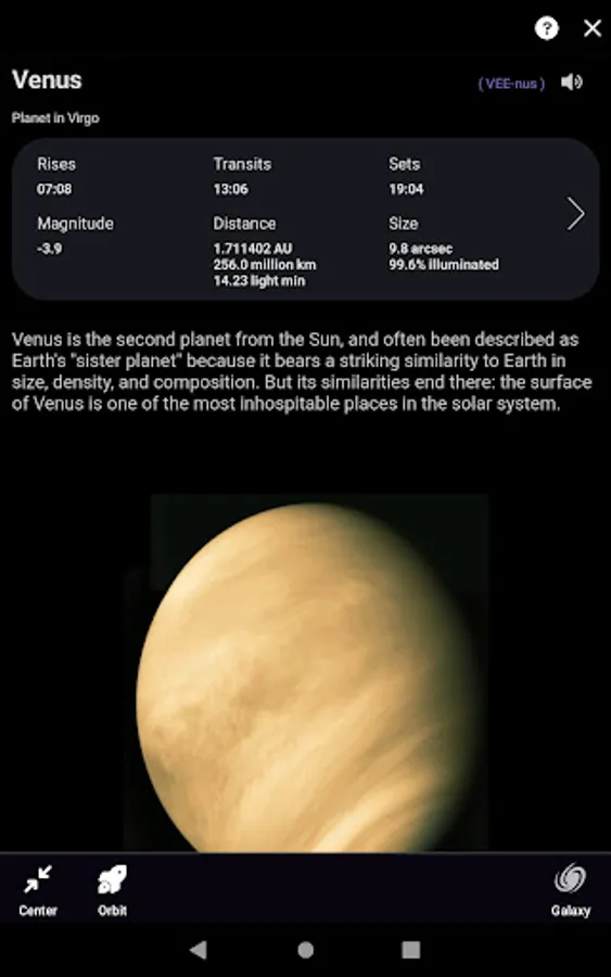 + Locate the Sun, Moon, or Mars from our extensive database and track the arrow to be directed to their exact locations in the sky before you. See spectacular views of Venus, Jupiter, Saturn, and other planets!