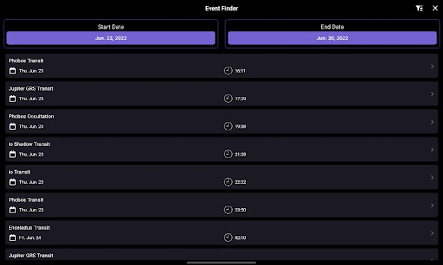 + Events Finder - go to the new Events section to unlock a powerful search engine that finds astronomical events visible tonight and far into the future. The finder dynamically generates a listing of moon phases, eclipses, planetary moon events, meteor showers and planetary phenomenon such as conjunctions, elongations and oppositions.