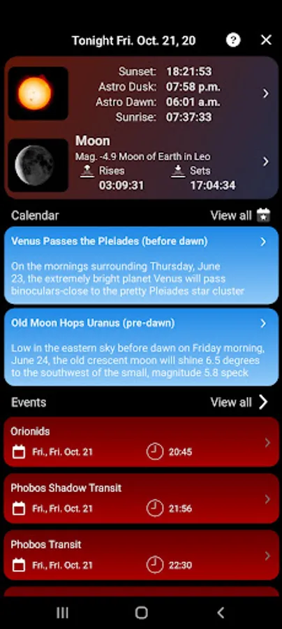 + Sky Tonight - jump to the new Tonight section to see what’s visible in your sky tonight. Expanded information has been designed to help plan your night and includes Moon & Sun info, calendar curations, events and the best positioned deep sky and solar system objects.