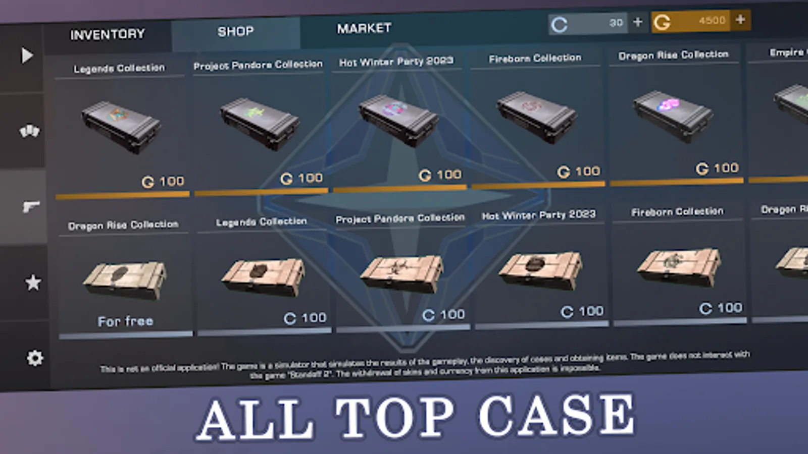 Case Simulator for Standoff 2 is a simulator for open case and boxe , in the game Case Simulator for Standoff 2 there is the possibility of simulating battles in the background and getting gold and various items . In the game , you can open box , buy and sell various items in the market and on the market , craft new items from those that fall out of cases , complete unique missions . The game was created to test luck and the chance of items falling out of cases .