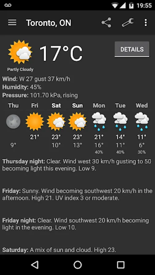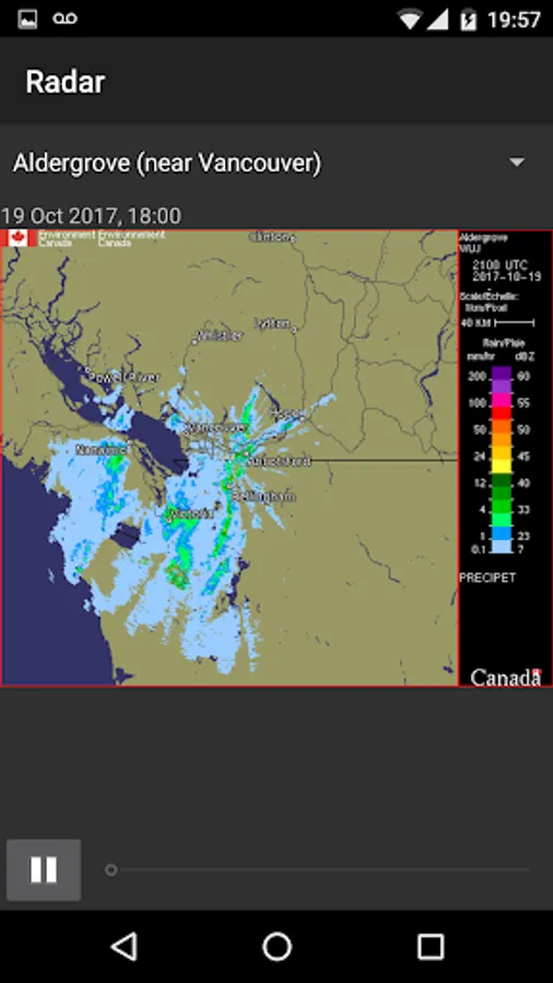 Canadian Weather from Abbotsford to Yorkton. Uses the most accurate Environment Canada data feed. Shows current conditions, 7 day forecast, and detailed forecast in one simple screen. Supports up to10 favorite locations. Displays satellite weather maps for North America and Canada. Displays animated radar information for Canada.
