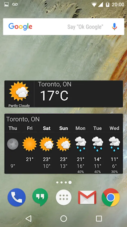 * Displays current conditions in the home screen widget