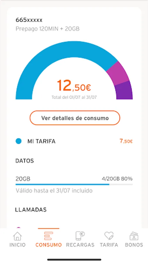 - Consumption current month: shows the euro, the megas and minutes you have used. If you also have bonus, you'll see your consumption in the new bar charts. You can also view graphs detailing the MB / MIN spent per day and consume estimate of what until end of cycle.