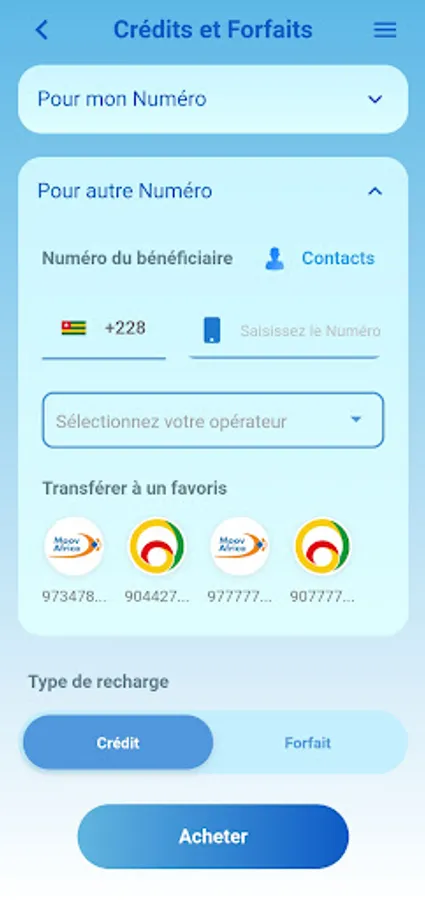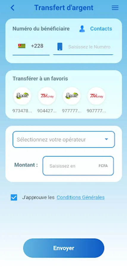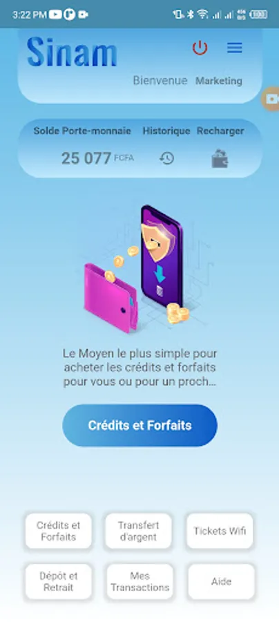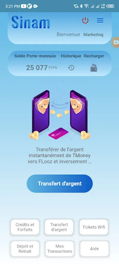 The Sinam application allows you from a single SIM card to buy credit & Package top-ups and to transfer the money to the two Mobile Operators in Togo, in particular Togocom and Moov.