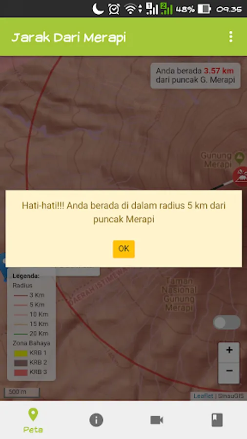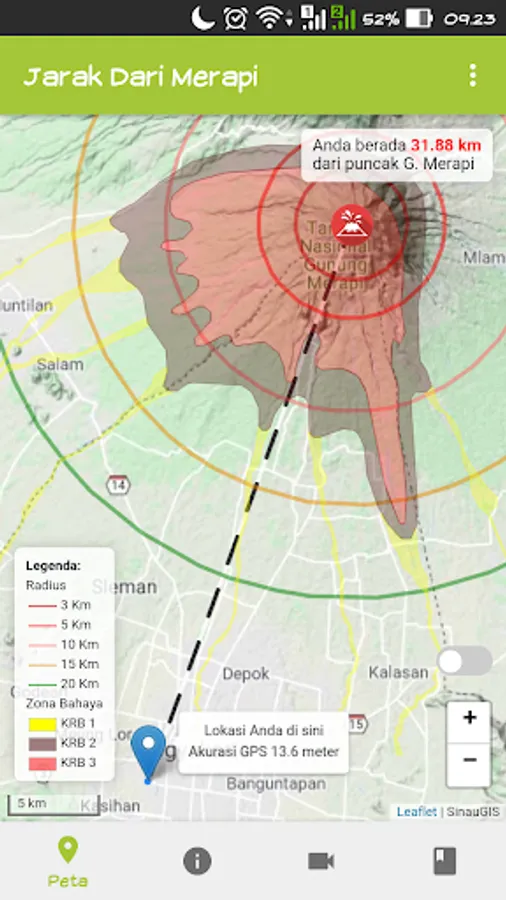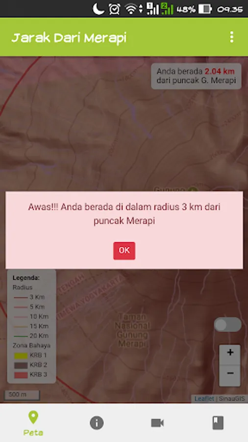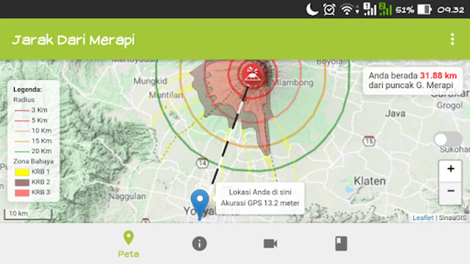 This application is intended to determine our distance from the summit of Mount Merapi. Our location is determined by the location of the GPS on the device. This application also presents info updates on Mount Merapi activities from its Twitter BPPTKG and CCTV monitoring of Merapi BPPTKG.