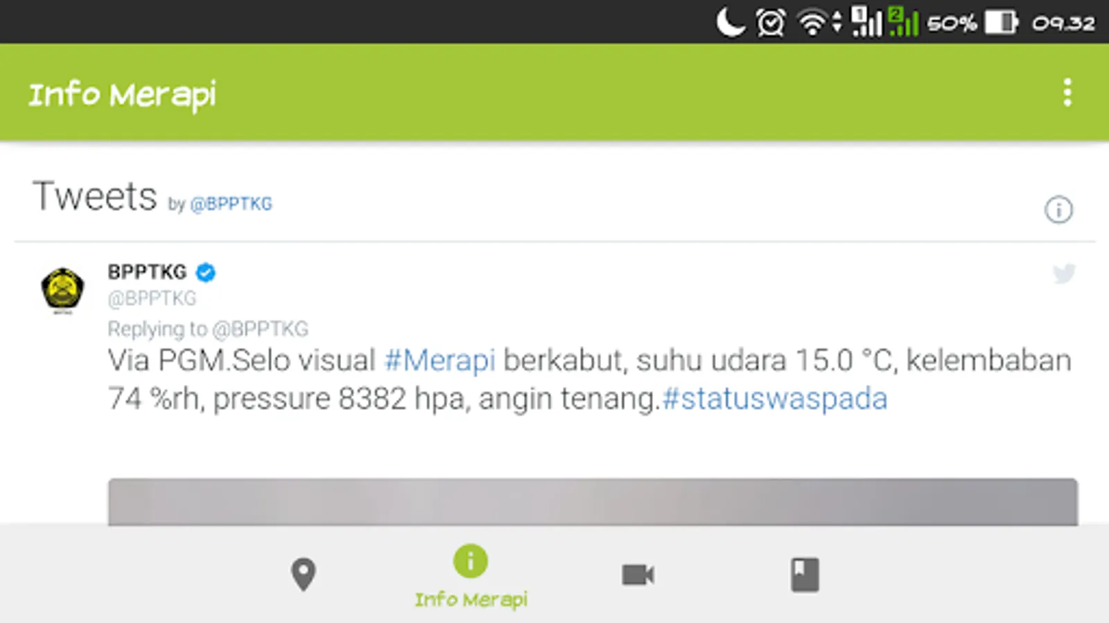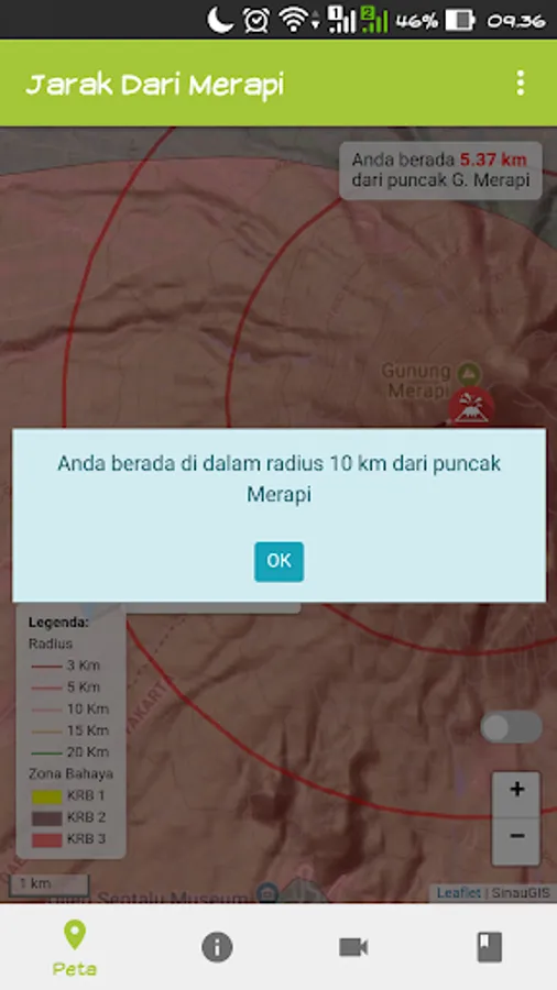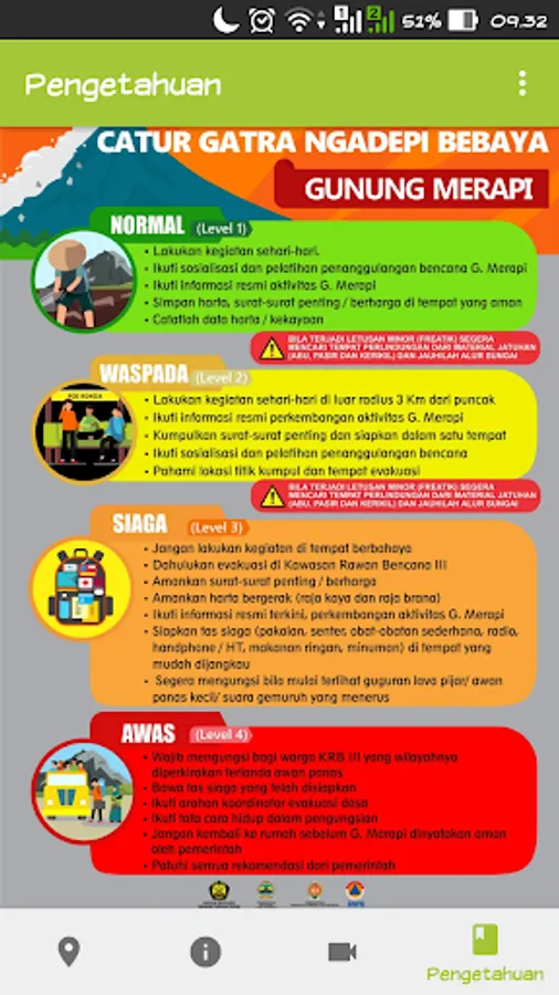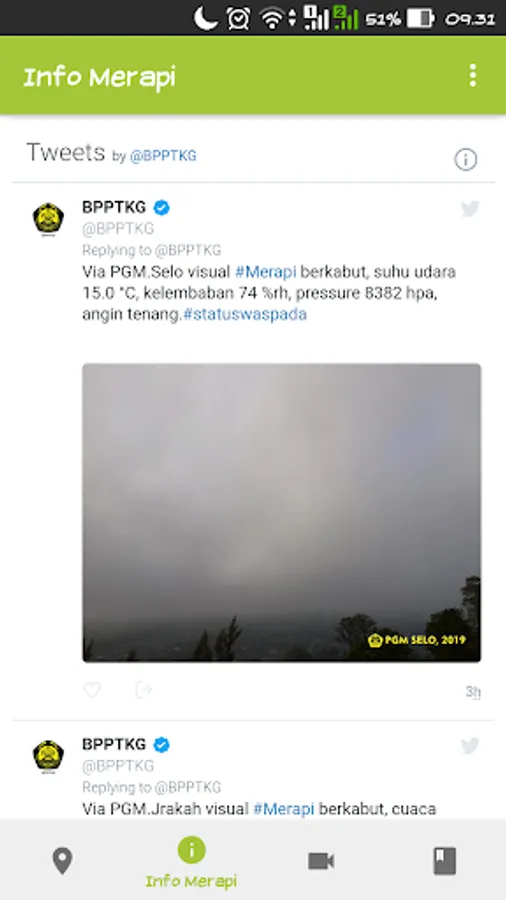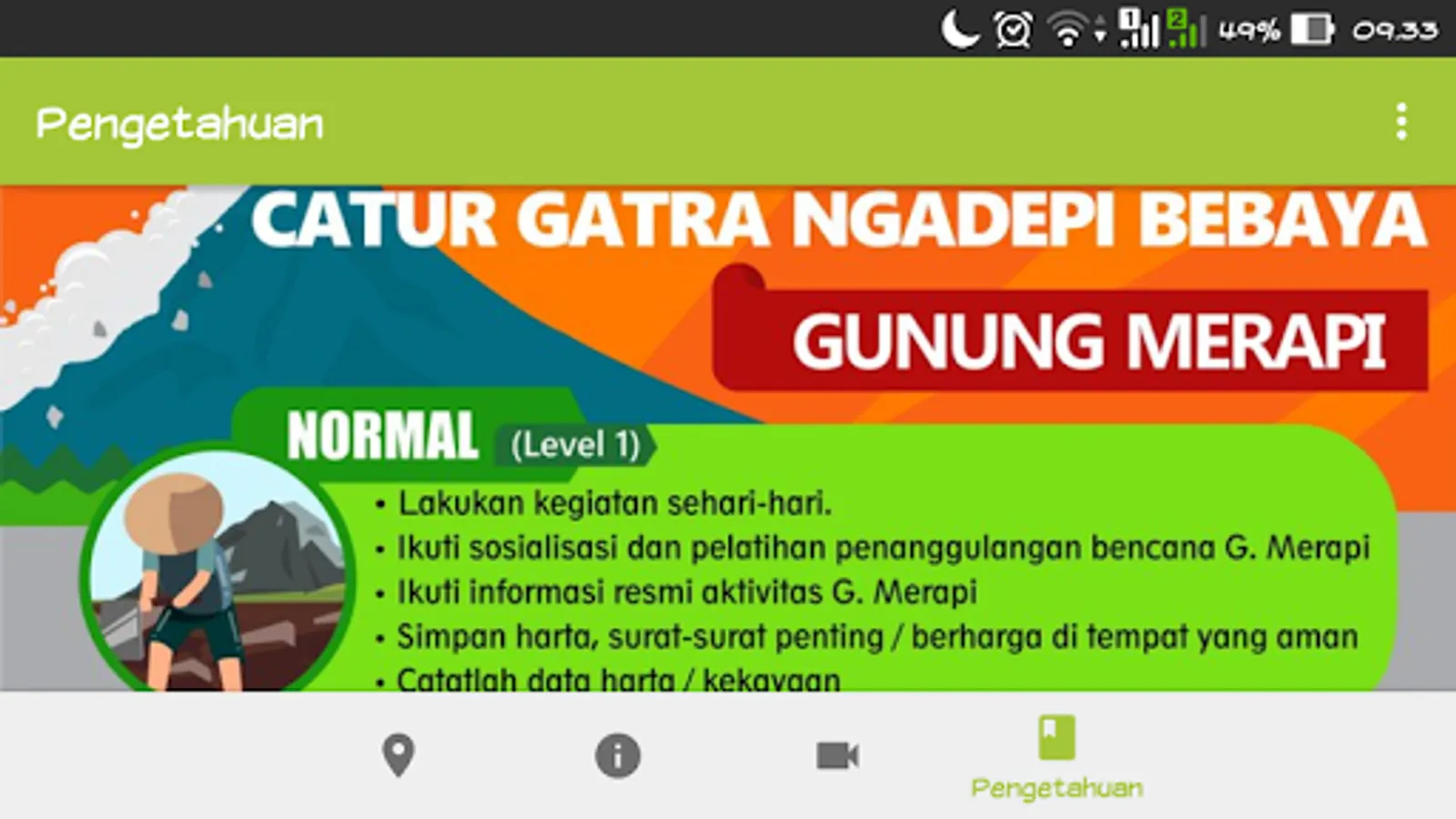 This application is intended to determine our distance from the summit of Mount Merapi. Our location is determined by the location of the GPS on the device. This application also presents info updates on Mount Merapi activities from its Twitter BPPTKG and CCTV monitoring of Merapi BPPTKG.