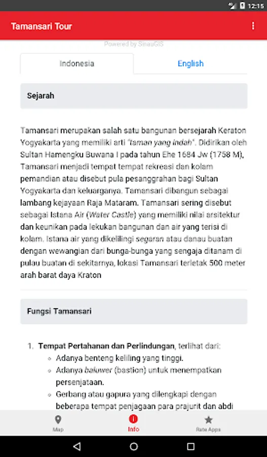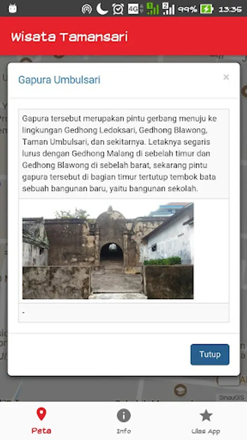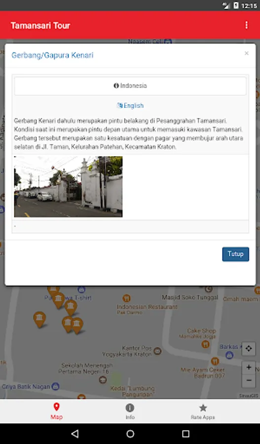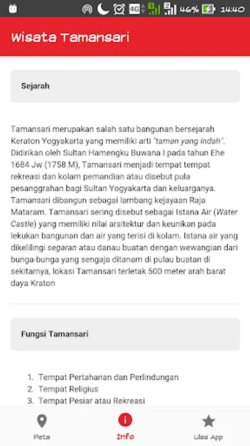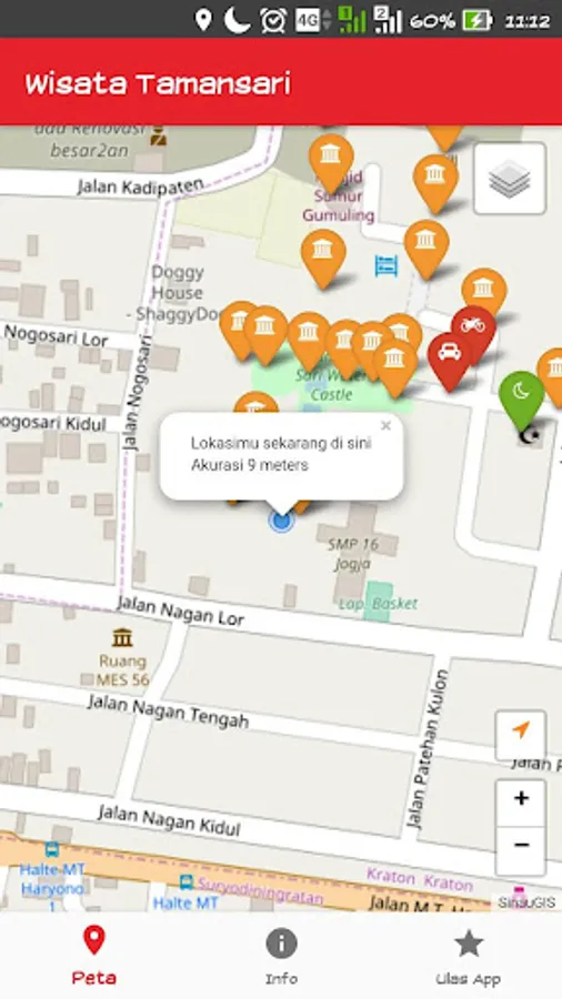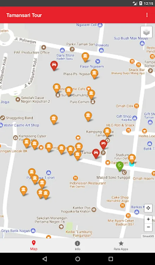 This application presents a map of location of attractions Tamansari Yogyakarta to guide you when traveling and are in a tourist complex pesanggrahan Tamansari Yogyakarta.