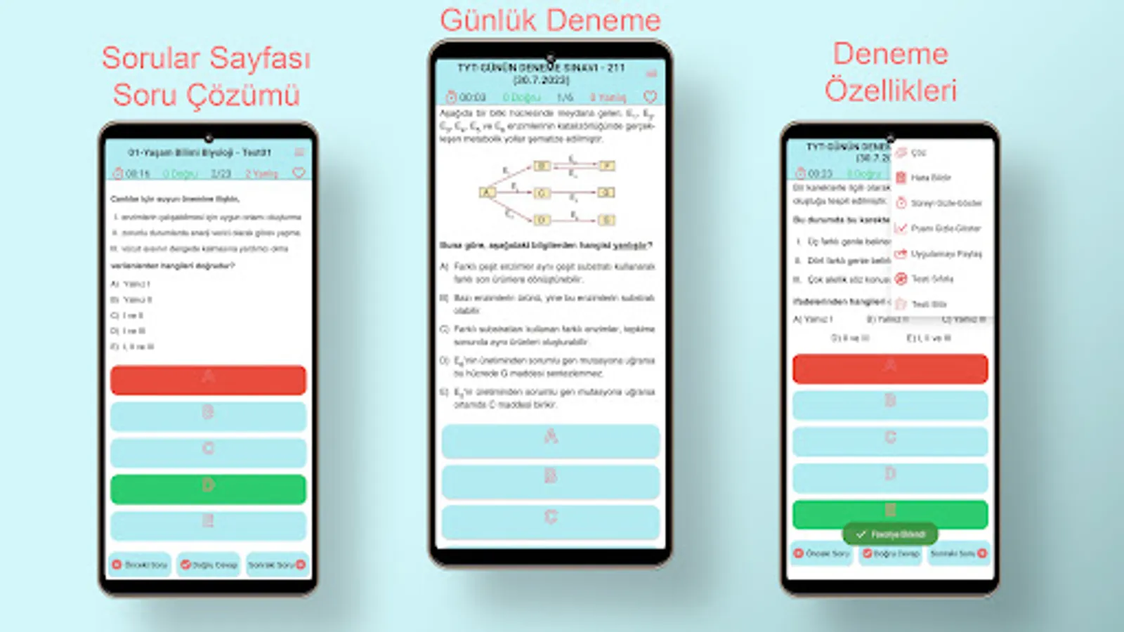 "YKS BIOLOGY QUESTION BANK" application contains many features that will help students to overcome their deficiencies in Biology subjects. Students can prepare themselves for the exam by solving the questions in the application. In addition, thanks to the "Trial Exam" feature in the application, students can solve the practice exam in conditions similar to exams.