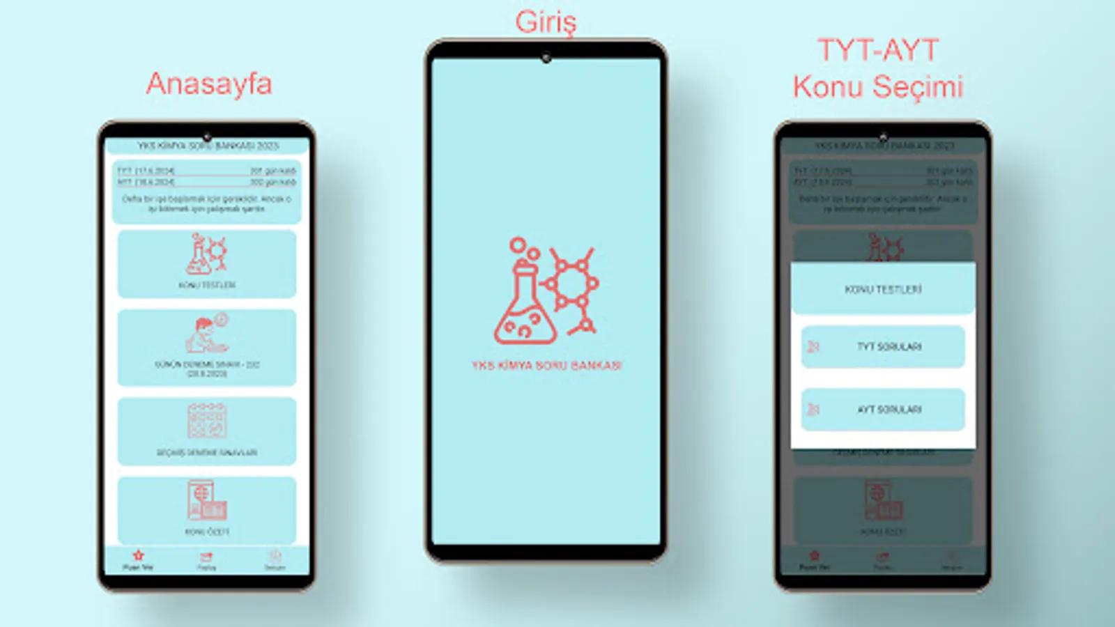 "YKS KIMYA QUESTION BANK" is an application prepared for chemistry subjects of students preparing for university exams in Turkey. It covers the Chemistry subjects in the Basic Proficiency Test (TYT) and Field Proficiency Tests (AYT) of the Higher Education Institutions Examination (YKS).