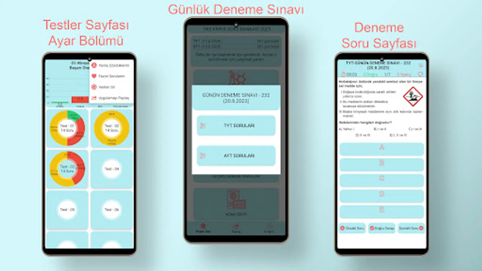 "YKS KIMYA QUESTION BANK" application contains many features that will help students to overcome their deficiencies in Chemistry subjects. Students can prepare themselves for the exam by solving the questions in the application. In addition, thanks to the "Trial Exam" feature in the application, students can solve the practice exam in conditions similar to exams.