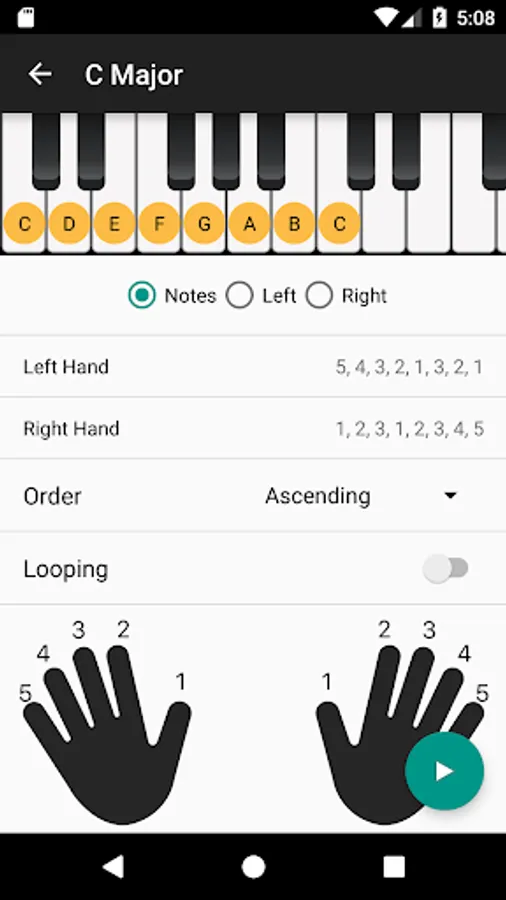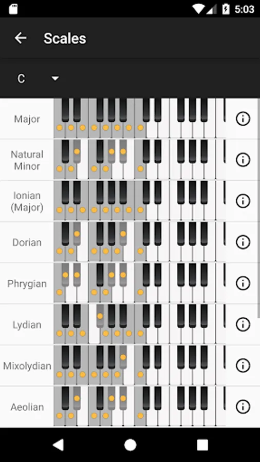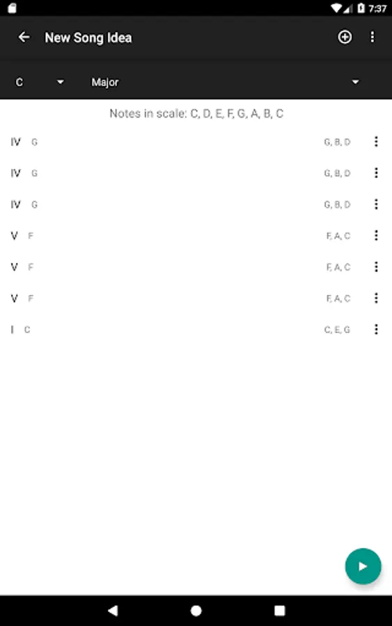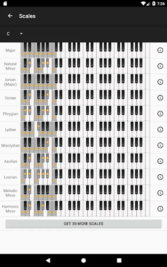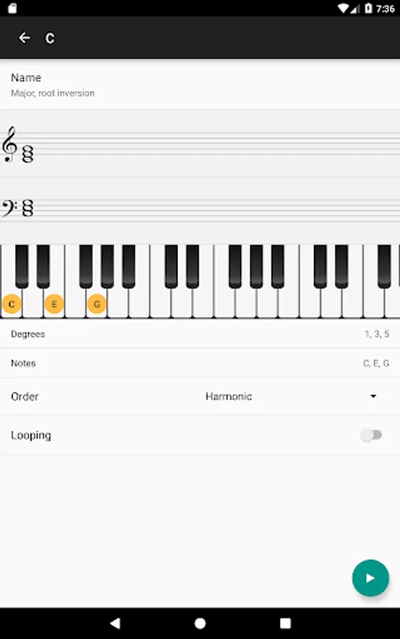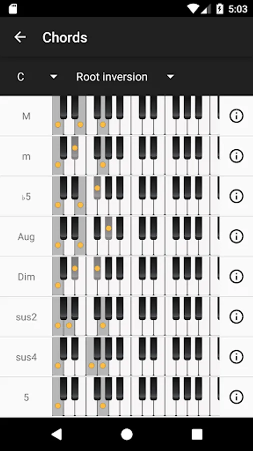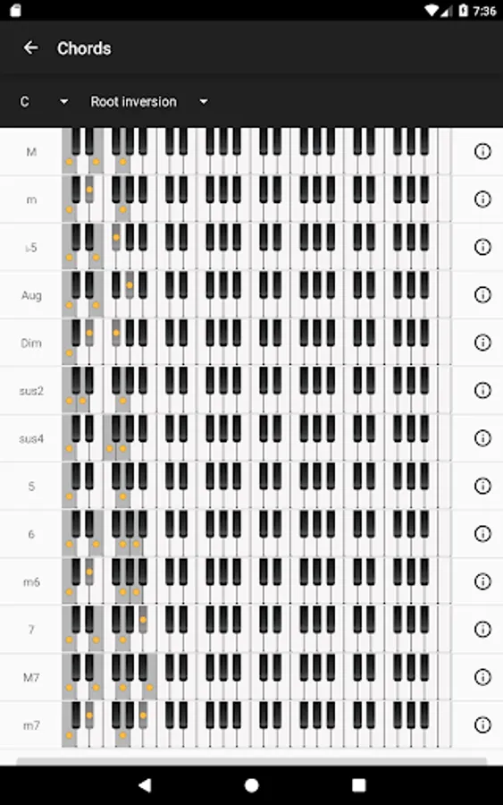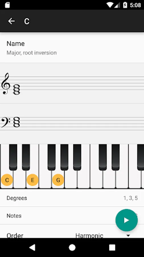 App contains large library of chords, scales and chord progressions. You can change root note, inversion, and the quality of progression. Audio playback is available for all the list and elements. Chords and scales contain detailed description. App contains ascending, descending note playback. Notes can be displayed on virtual piano and staff views. Scale fingerings are available for all scales and they are displayed dynamically when scales is played. App also includes song composer that allows you to easily layout chords progressions. Song composer has recommend chord feature based on selected scale. This lets you find great ideas for songs or improve your existing songs. Simply listening to a key in its different modes can easily strike up an idea for a melody or riff.