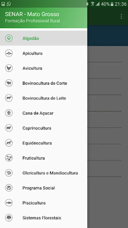 All training institution are free and meet the demands of the top 15 supply chains of Mato Grosso soybean production and Milhocultura (soy and corn), cotton production (cotton), Cattle Court (beef), Cattle milk (dairy products) , sugar and Alcohol (sugar and sugar cane products) Beekeeping (honey production), poultry (birds), sheep and goat Farming (sheep and goats), Equideocultura (horses, mules and donkeys), fruits (fruits), vegetable Crops and cassava (vegetables and cassava ), fish farming (fish), Forest Systems (timber, syringe and management), Cafeicultura and swine (pigs).