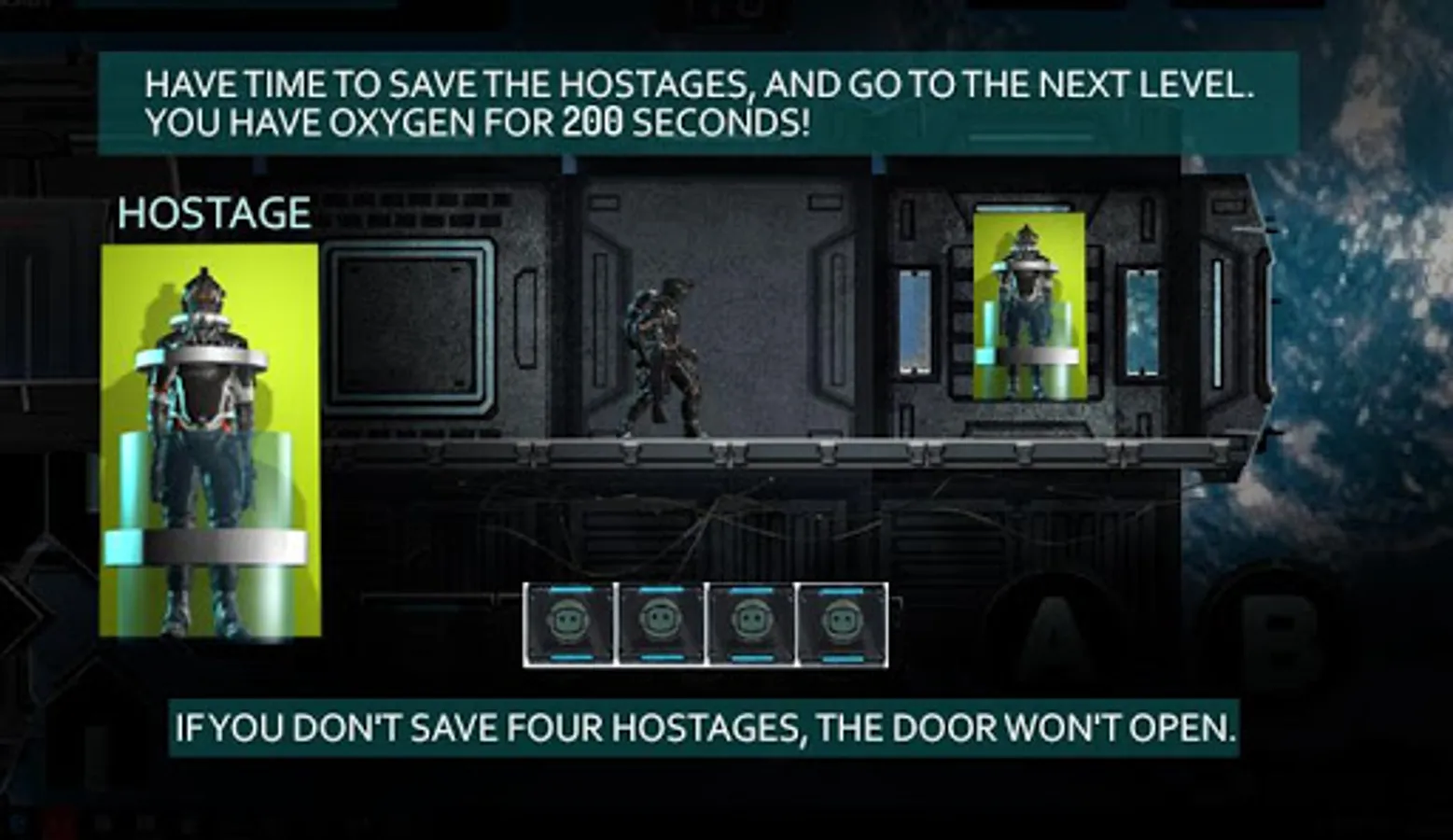 Have time to save the hostages, and go to the next level. you have oxygen for 200 seconds!