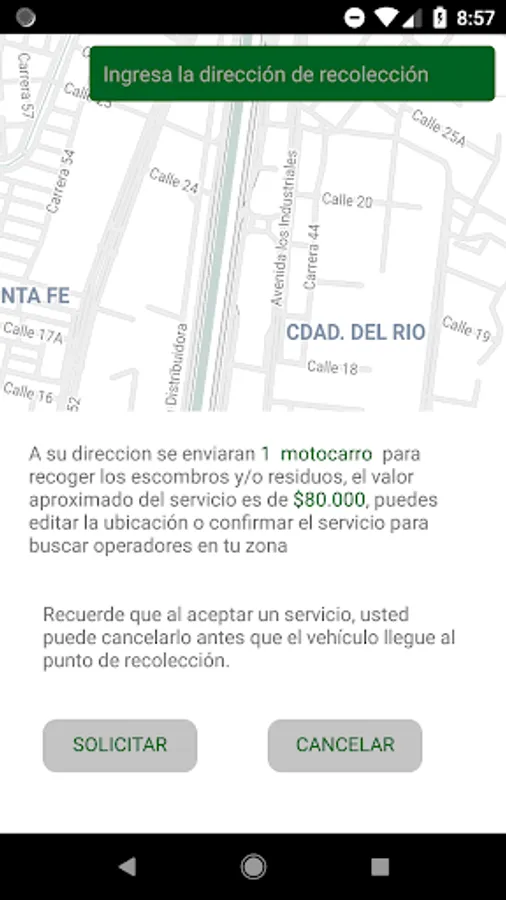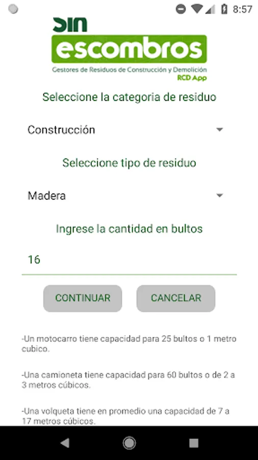 Currently, the App manages your RCD waste with three types of key managers; the motocarro, the truck and the dump truck. Some of the three will be sent to the place you indicate collection according to the amount of waste you generate. You can follow the path of your managers from the point of collection to the point of disposal from your cell phone.