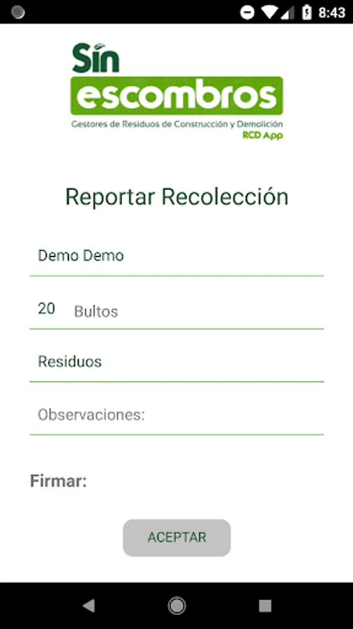 No debris App is a tool that connects RCD construction and demolition waste generators, both large and small, with their managers or operators. When you make a reform in your home or a large construction in your city generates waste, the App wants to facilitate the work of disposition to give you the solution of the correct disposition according to the national regulations at your fingertips.