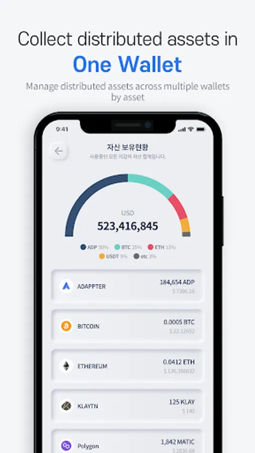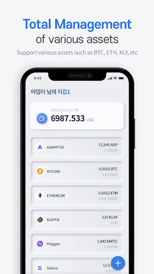 1. Cryptocurrency asset management: Multi-chain asset management is supported, and all assets can be integrated & checked at a glance. We support assets such as BTC, ETH, ADP, SOL, KLAY, and more. More items will be added continuously. In addition, we provide APIs and Dapp browsers for payment and authentication in decentralized apps.