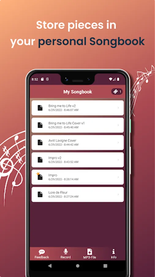 With the Melody Scanner App you can create on-the-go recordings of your instrument. Those are uploaded to your personal cloud songbook and transcribed to score.