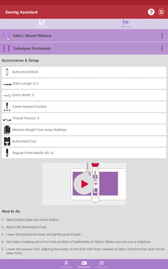 - Learn how to set up and use specific sewing techniques with step-by-step guides