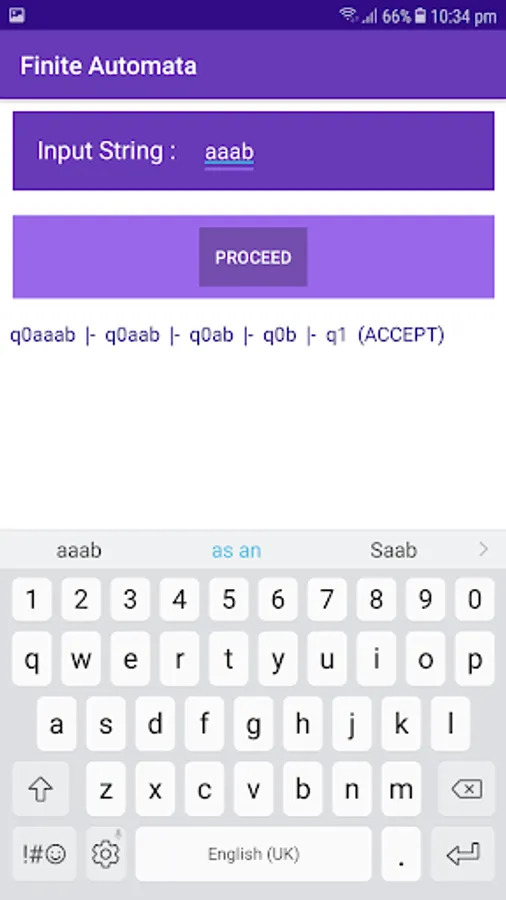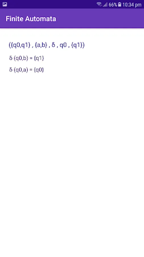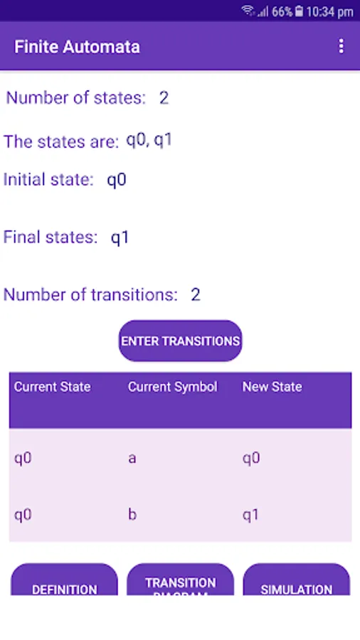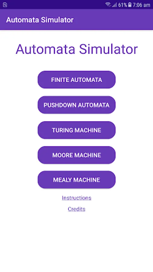 This app can be used to simulate finite automata, pushdown automata,Turing machines, Moore machines and Mealy machines. This app is meant to be used as an instructional tool in a course on automata theory. For more information on automata simulators, please refer to Chakraborty et al. (2011) [Chakraborty, P., Saxena, P. C. and Katti, C. P. 2011. Fifty years of automata simulation: a review. ACM Inroads, 2(4): 59-70.]. This app has been developed by Simra Afreen and Tuhina Singh.