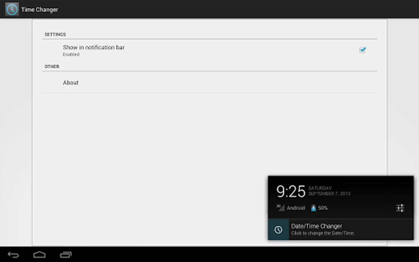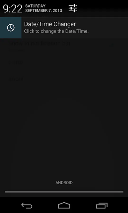 This application is for all you Android Developers and Quality Assurance testers that constantly need to change the date/time on an Android device in order to test your application. This puts a convenient shortcut up in the notification bar that will take you straight to the phones date/time settings screen.