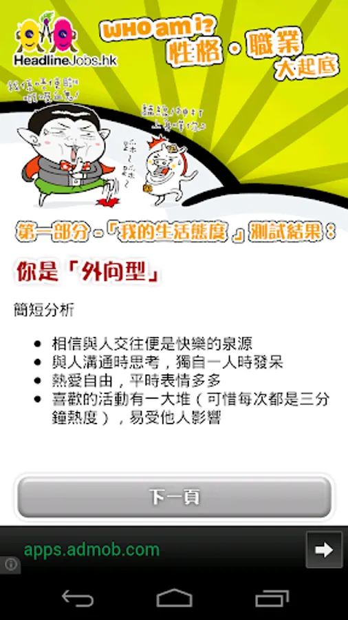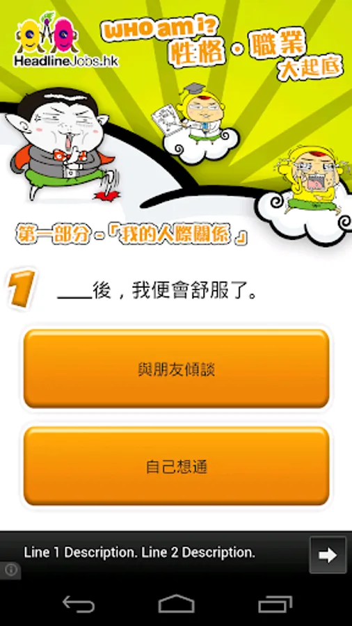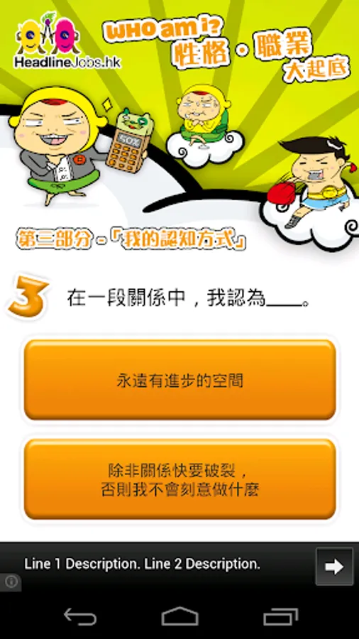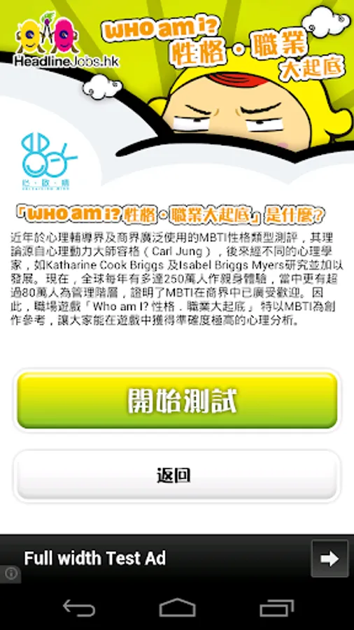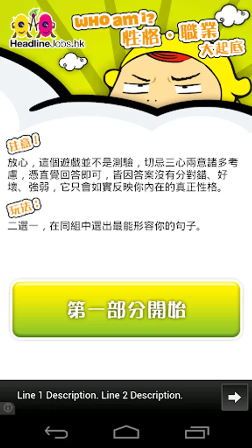 Game is divided into four parts, including "My relationships", "My attitude to life", "My ways of knowing" and "My choice approach", were tested four parts associated with your personality type.