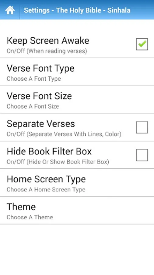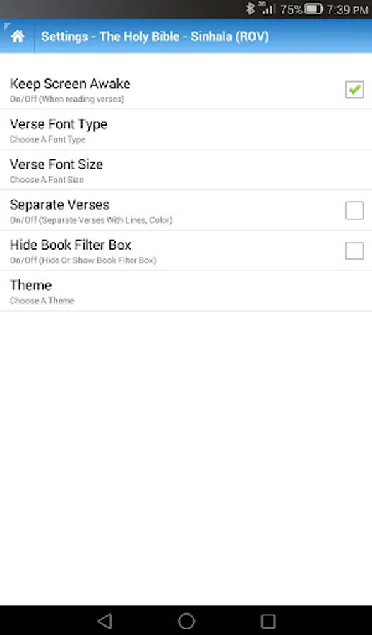 ✓ Keep screen awake when reading the bible verses (On / Off).