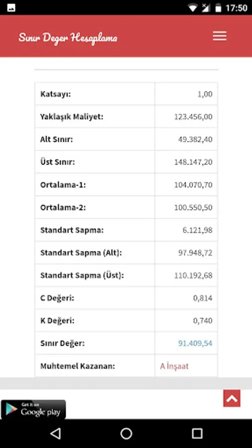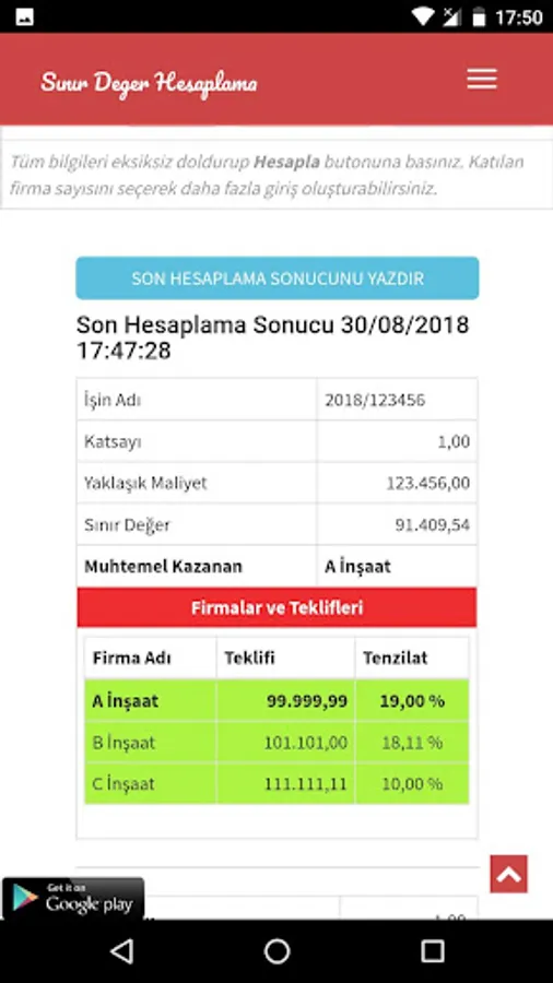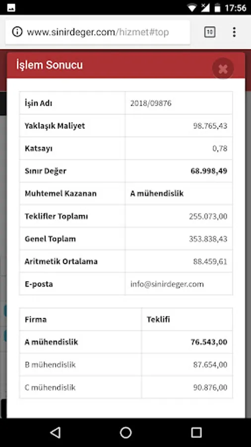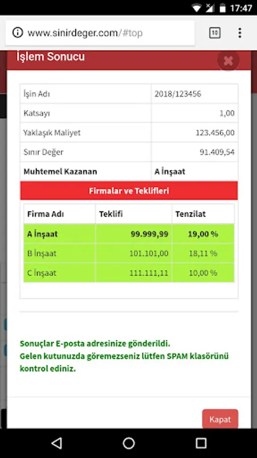 You can use it free of charge in Construction Auctions Limit Value Calculations. You can send the result to the desired e-mail address.
