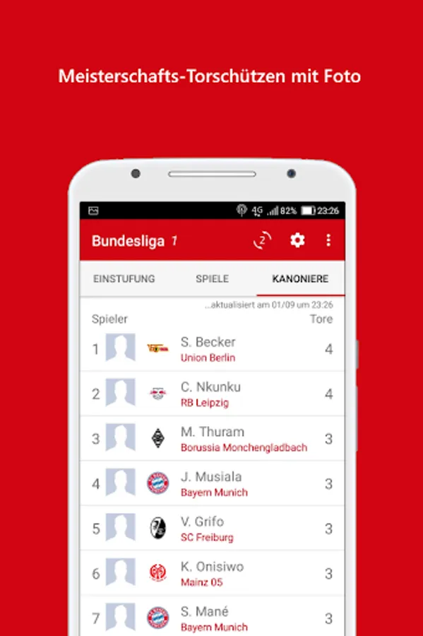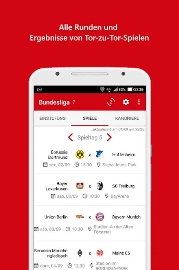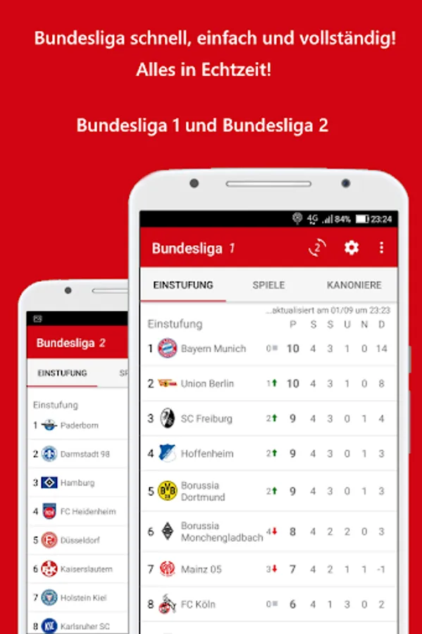Stay up to date on the Bundesliga round, know the start and finish of matches, get goal notifications from your team, check round scores and lineups. Use this app to see the ranking of the teams in the Bundesliga table 2023/24, first and second division matches, round goals, league top scorers and news from Germany's biggest football league!