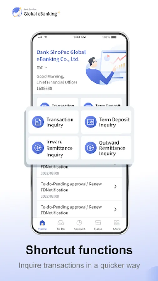 Function shortcuts help you inquire transaction details immediately, letting you get important messages and account information.