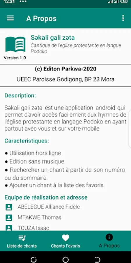 Sǝkali Gali Zǝta is an android application allowing easy access to the collection of hymns of the Protestant church in the Podoko language