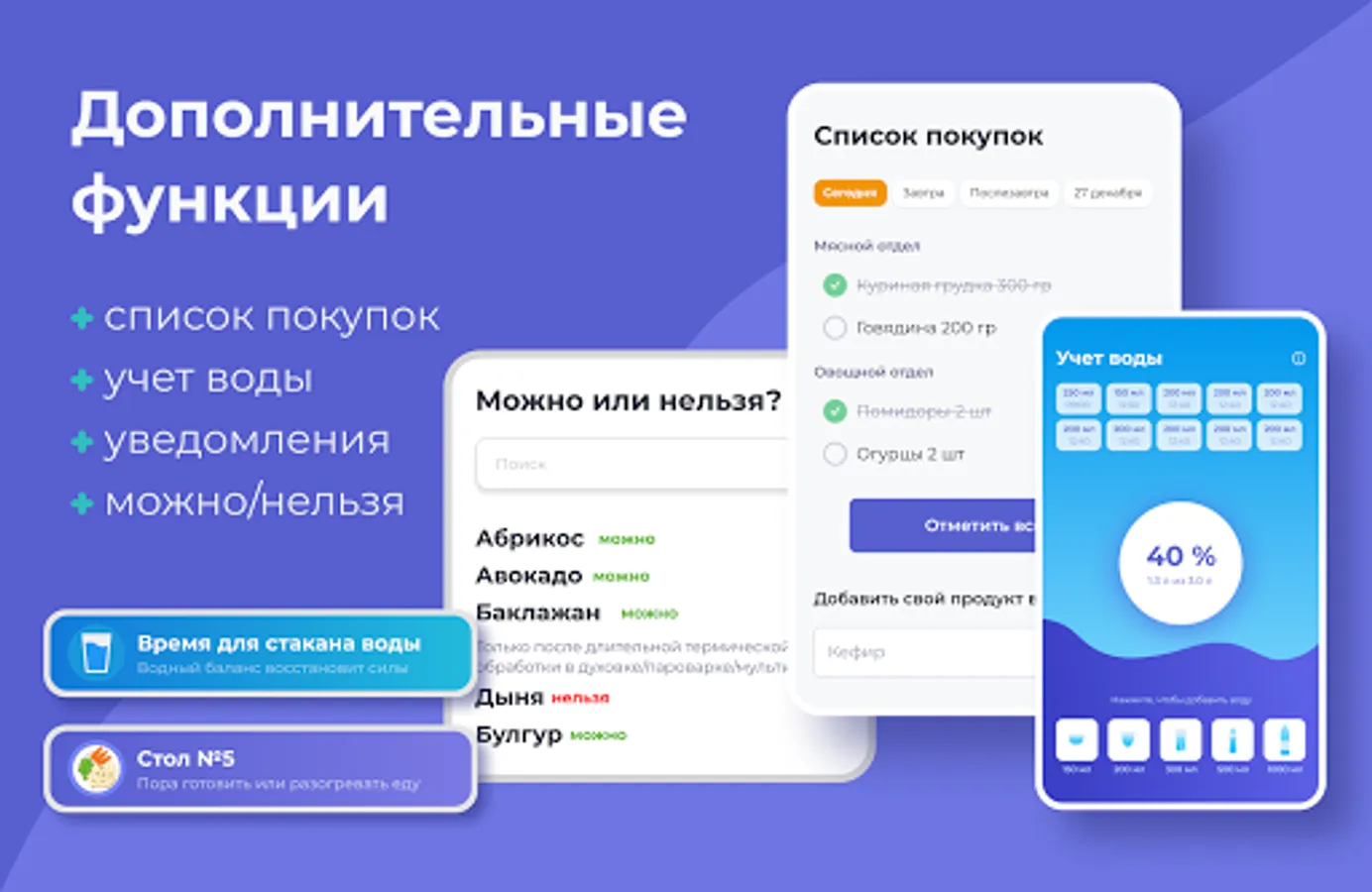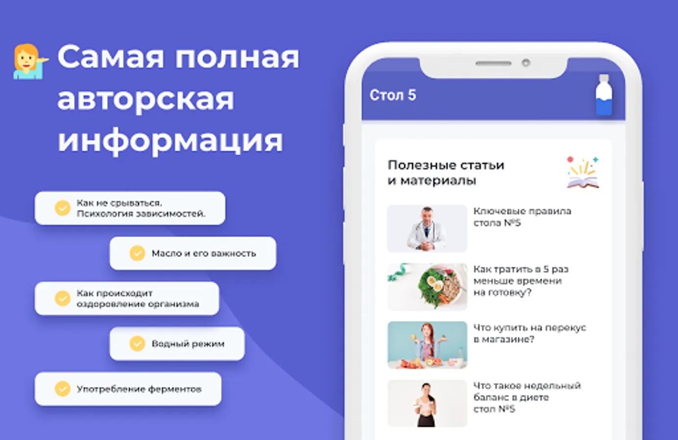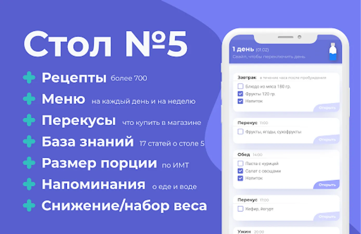 More than 700 recipes, many menu options for every day with alternatives, an automatic shopping list for the store, a searchable can / cannot section, 17 detailed articles about table # 5 from nutritionists and gastroenterologists, a reminder to drink water.