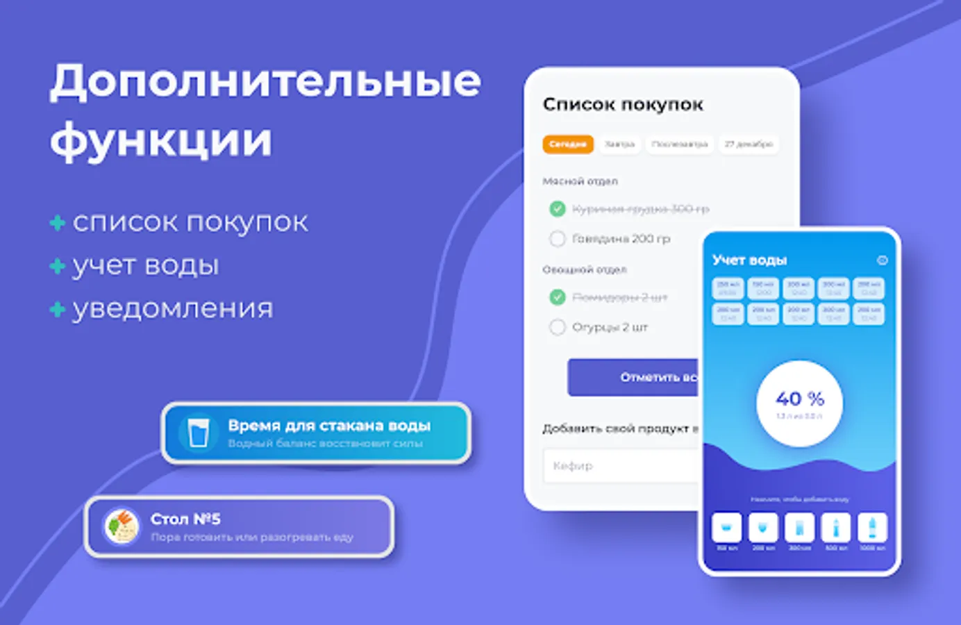 Consists of 3 main meals (breakfast, lunch, dinner) and 1 snack. You can choose what you like best from the dishes of different categories. Don't like fish or seafood? It doesn’t matter: the application will offer replacement recipes from meat or poultry.