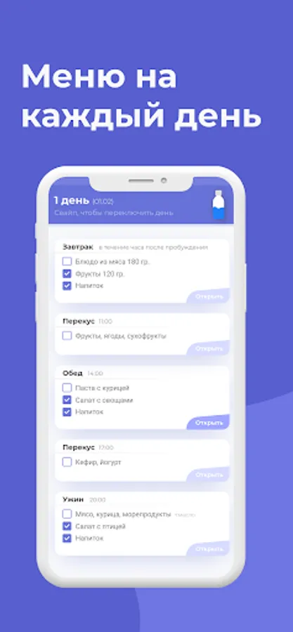 Consists of 3 main meals (breakfast, lunch, dinner) and 2 snacks. You can choose what you like best from the dishes of different categories. Don't like fish or seafood? It doesn't matter: the application will offer replacement recipes for meat or poultry.
