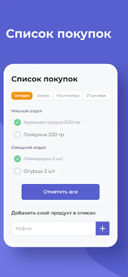 When you create a menu by choosing recipes in the app, a shopping list for the coming days is automatically generated. All products are divided into departments of the store, and each item from the list can be marked as purchased with one click.