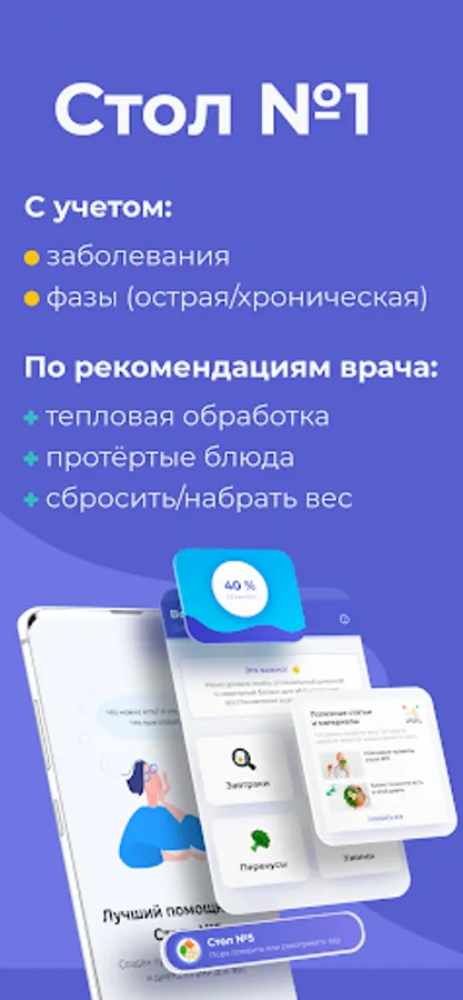 The application "Table No. 1" will support you when switching to a therapeutic diet and organize meals according to the recommendations of the attending physician. This is not just a collection of recipes: the application creates a menu taking into account the wishes to lose/gain weight, find answers to the most common nutrition questions, keep track of water and make a meal schedule. For greater convenience, after selecting dishes, an accurate shopping list for the day is automatically compiled.