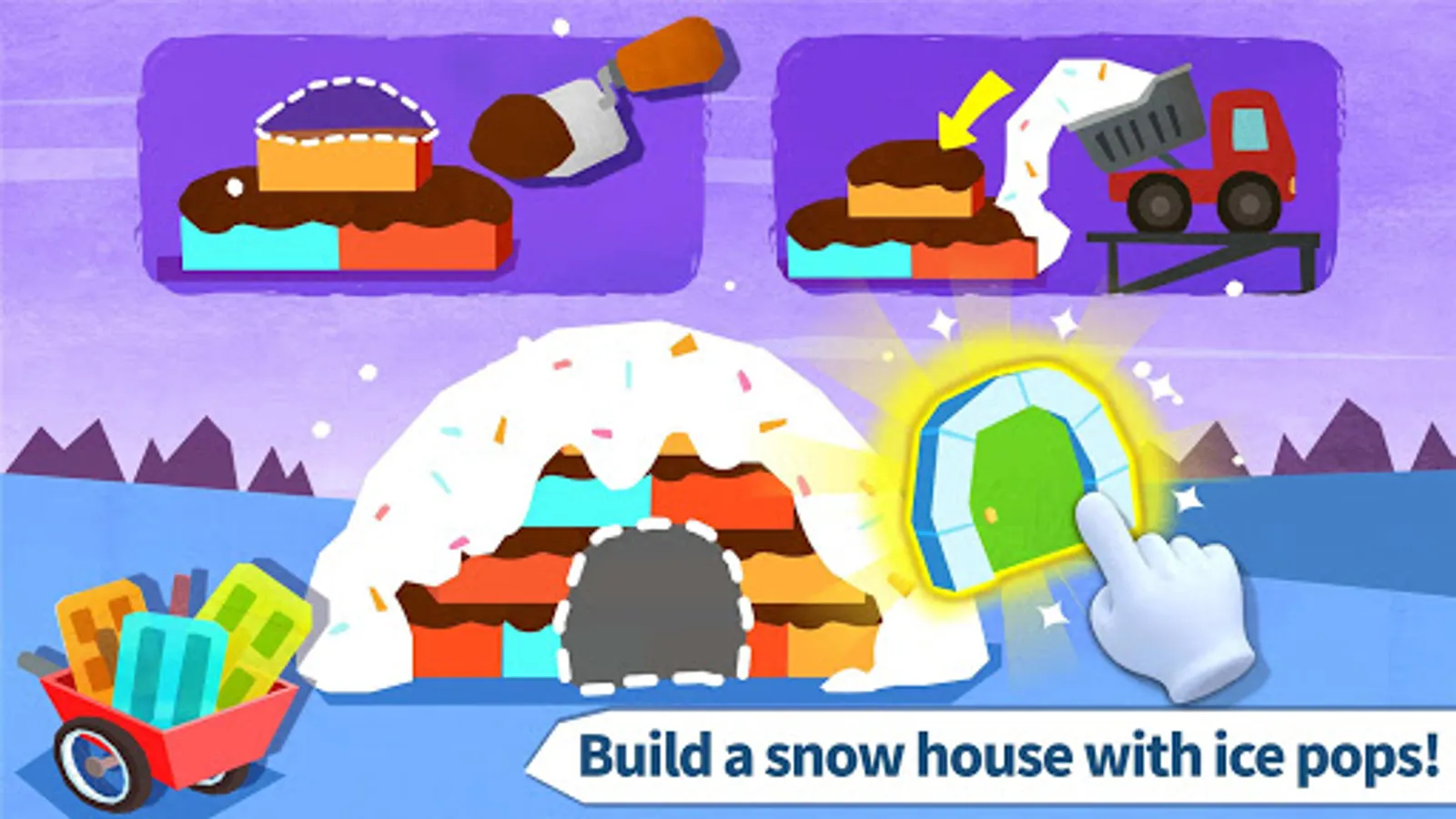 Pile up ice pops and stick them together with ice cream to build a wall! Cover the wall with ice, then install a door and windows, and the penguin has a home!