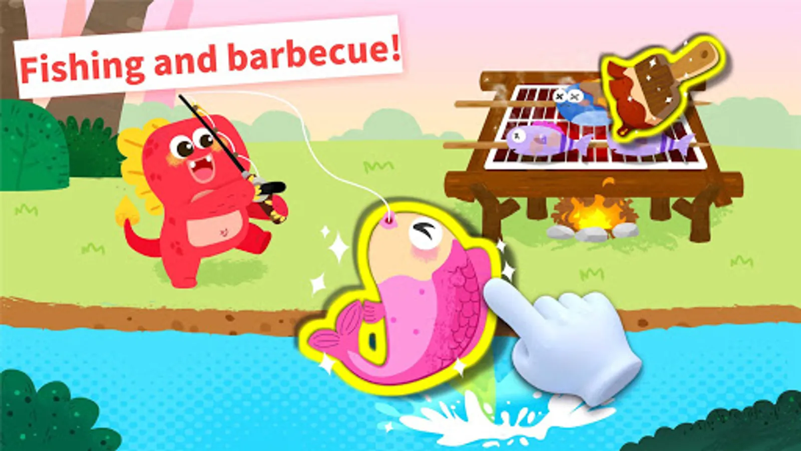 Let's have an outdoor barbecue! First go fishing by the river, and then find some woods to make a fire. Put the fish on the grill to start cooking! Let’s share the food with monsters! Wow! Grilled fish is yummy!
