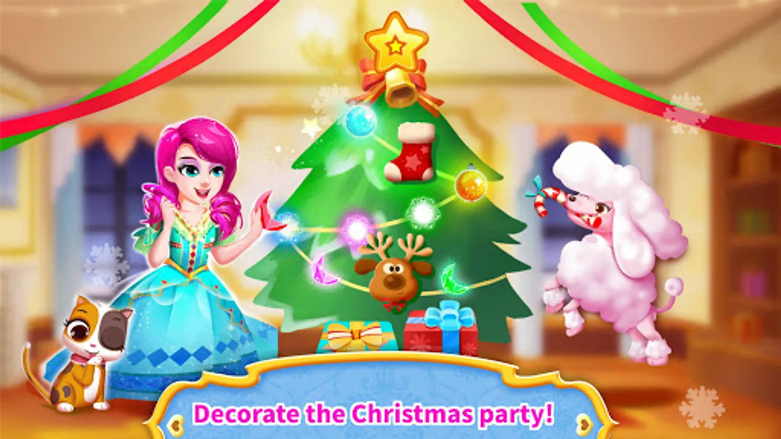 The princess and her pets are off to the party! The party decorations are not done yet? Hang up the Christmas colored lights. Decorate the Christmas tree with bells and Christmas stockings. Don't forget to get your Christmas presents ready!