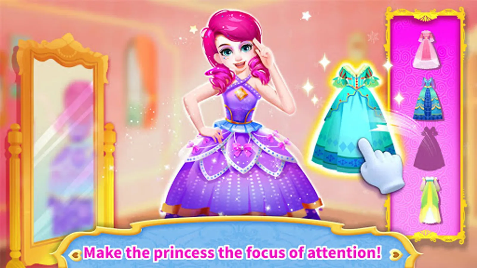 There are stylish gowns in the dressing room of the princess: bright yellow fishtail dress, pink bubble skirt...Does she look good in the bubble skirt? Please try it on!