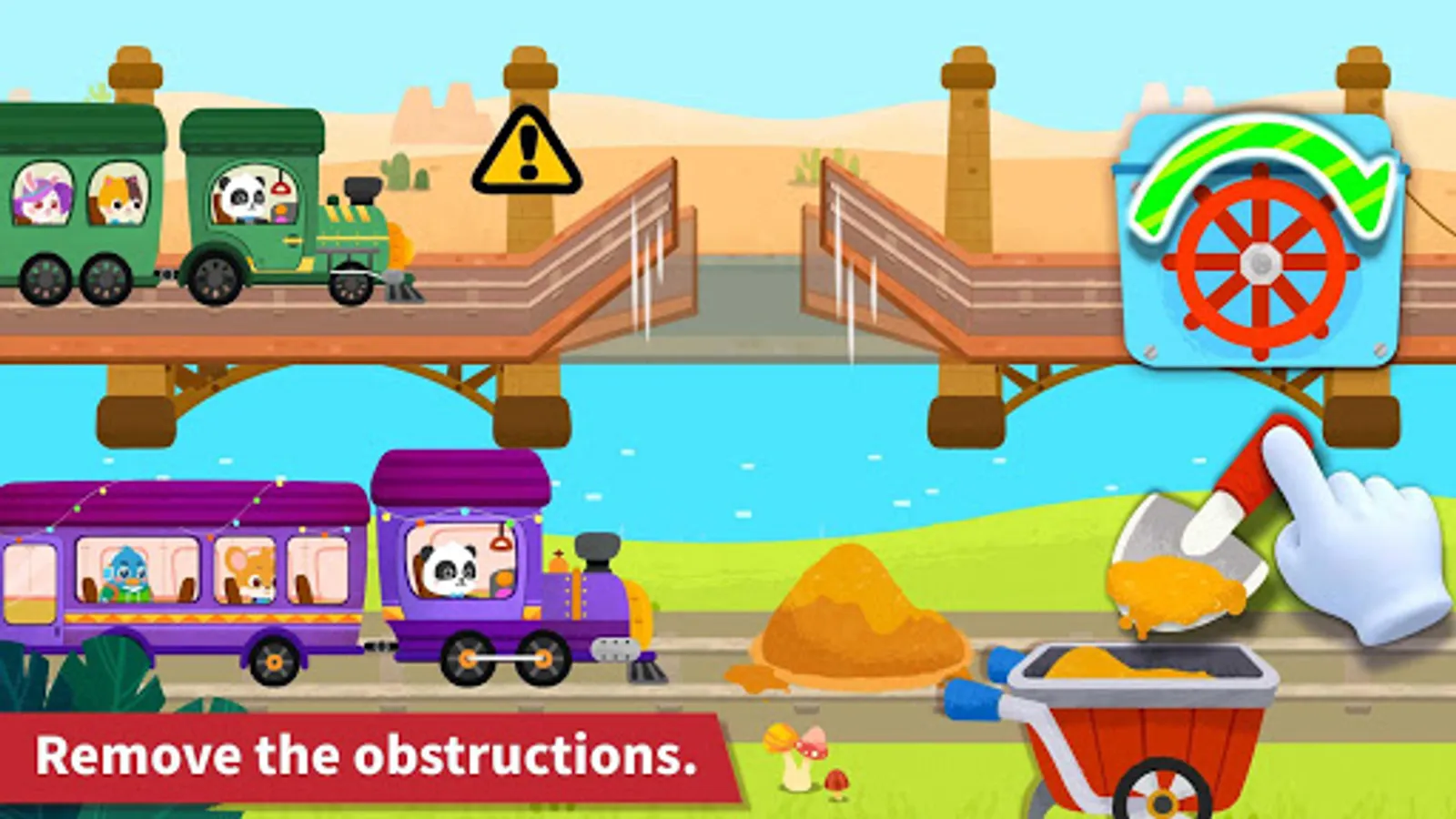There's a break in the track. What should you do? Fix the track with sleepers and rails! A barrier is blocking the train. Control the mechanism to raise the barrier! Some sheep are on the tracks. Give them a nudge and they will baa-ck off from the tracks! Think how you can overcome the challenges and send your passengers and the goods on their way to the destinations!