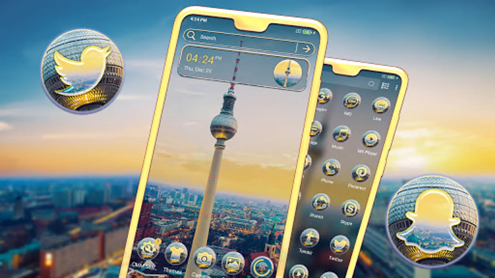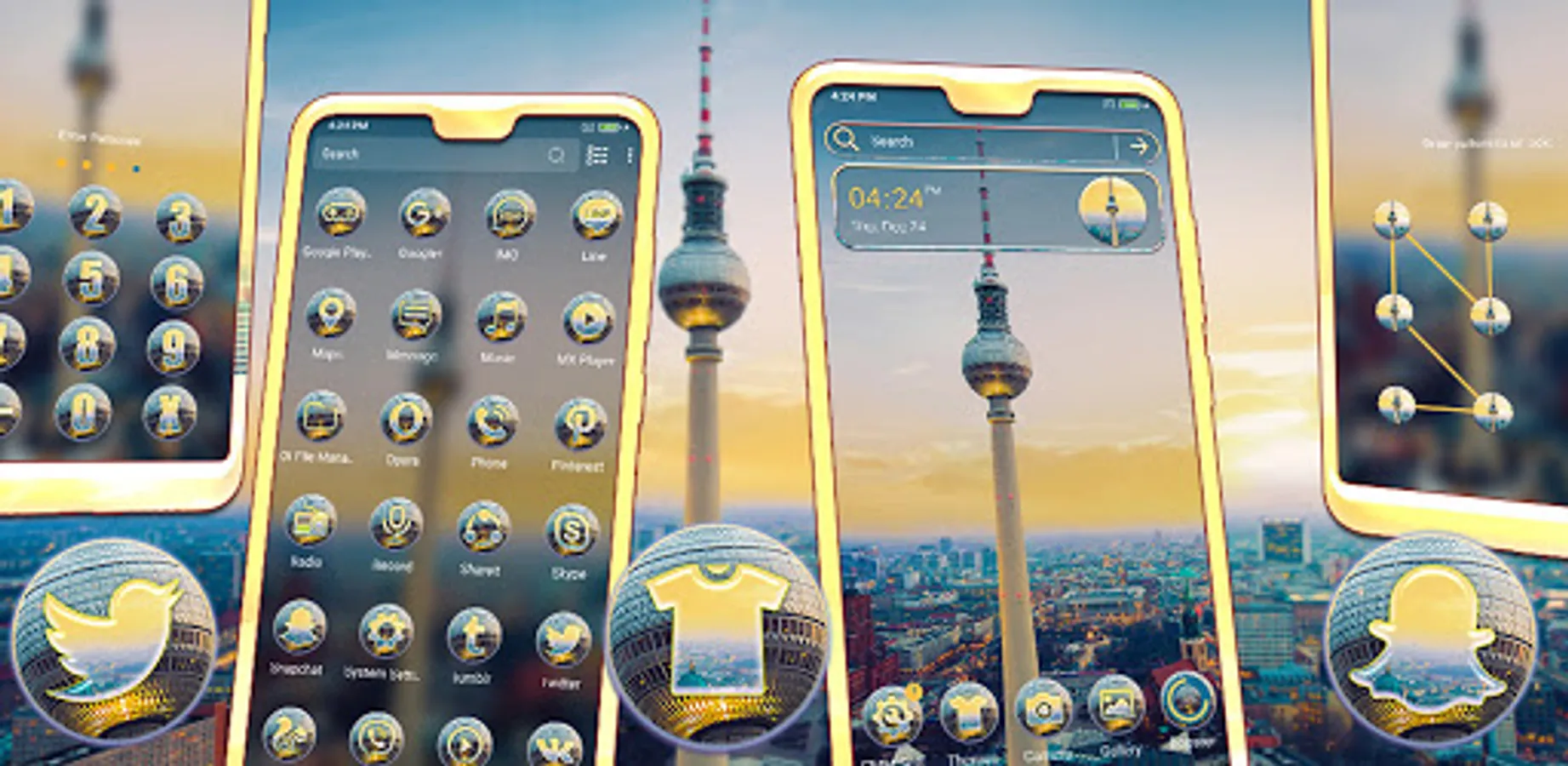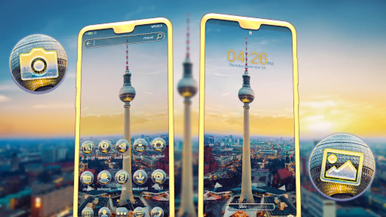 Do you want to change the look of phone without spending a penny? Yes It's possible; Right! No need to buy a new phone to change look of your phone. Just install this Berlin TV Tower Theme, It will personalize your smartphone phone screen in a way that suits better. Berlin TV Tower theme consists of variety of icon packs & HD Berlin Wallpaper, also it will be applied automatically in a seconds and don't need to customize manually. This Theme's icon set is crafted by world's top designers.